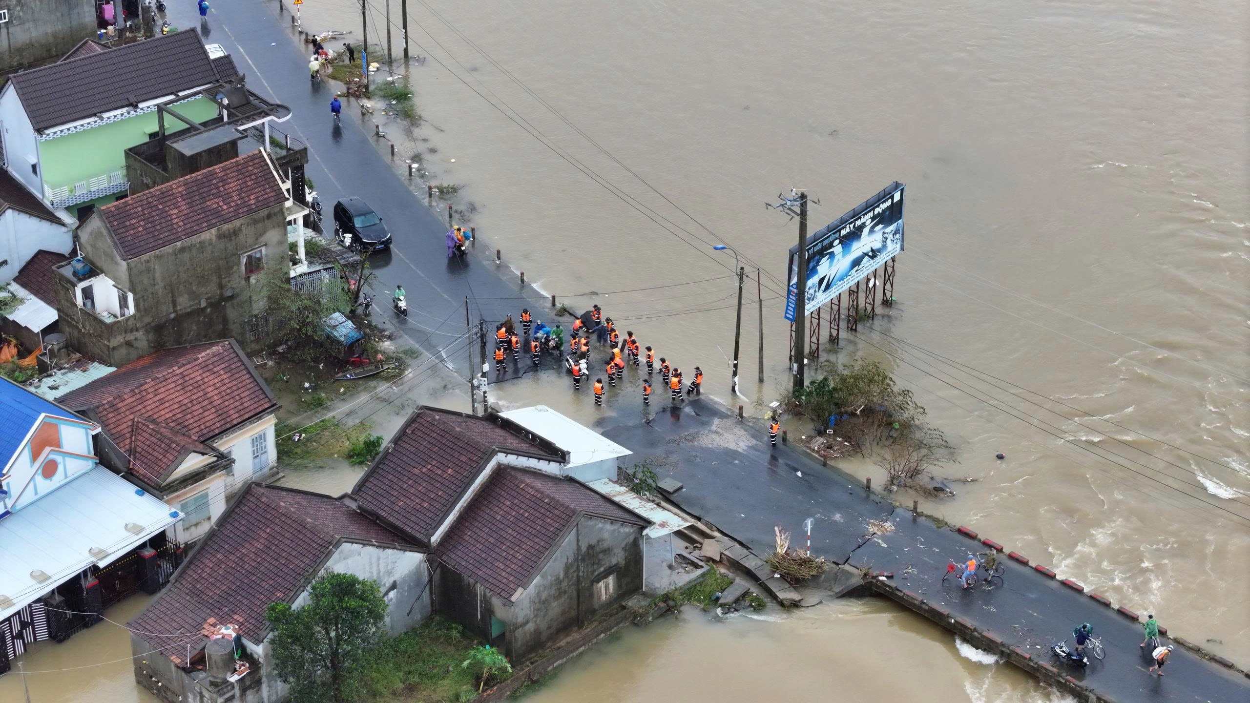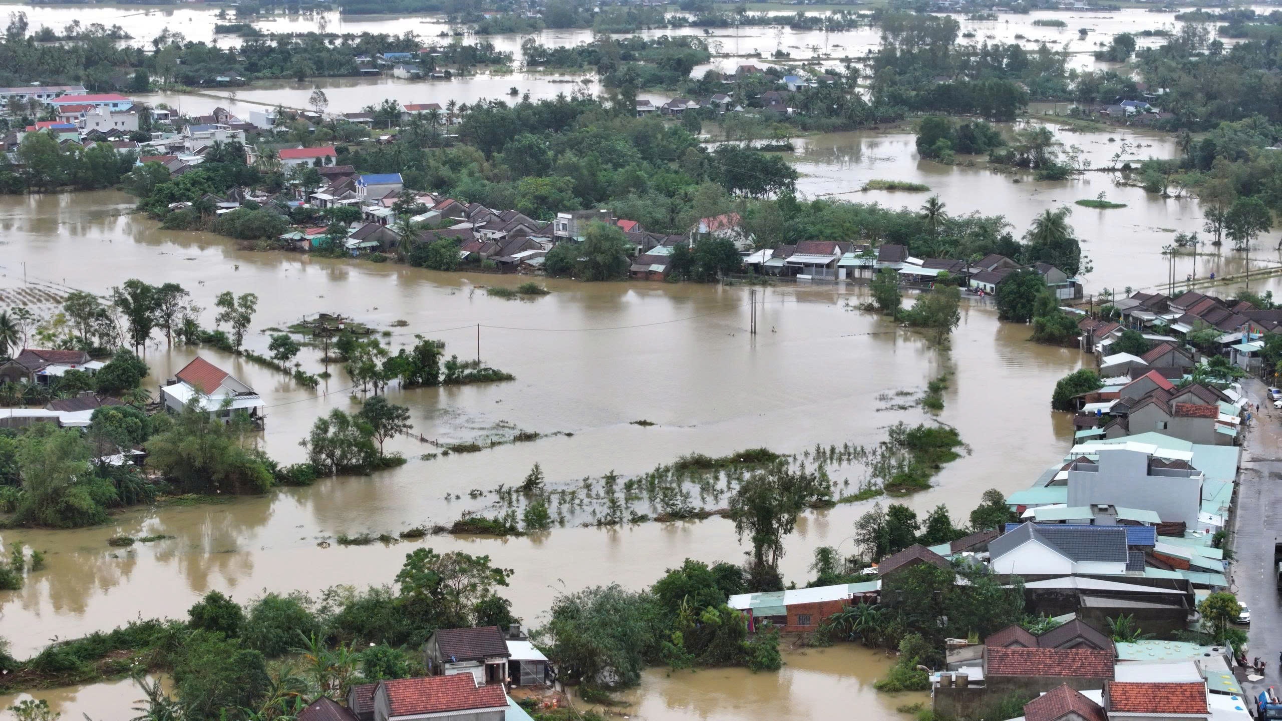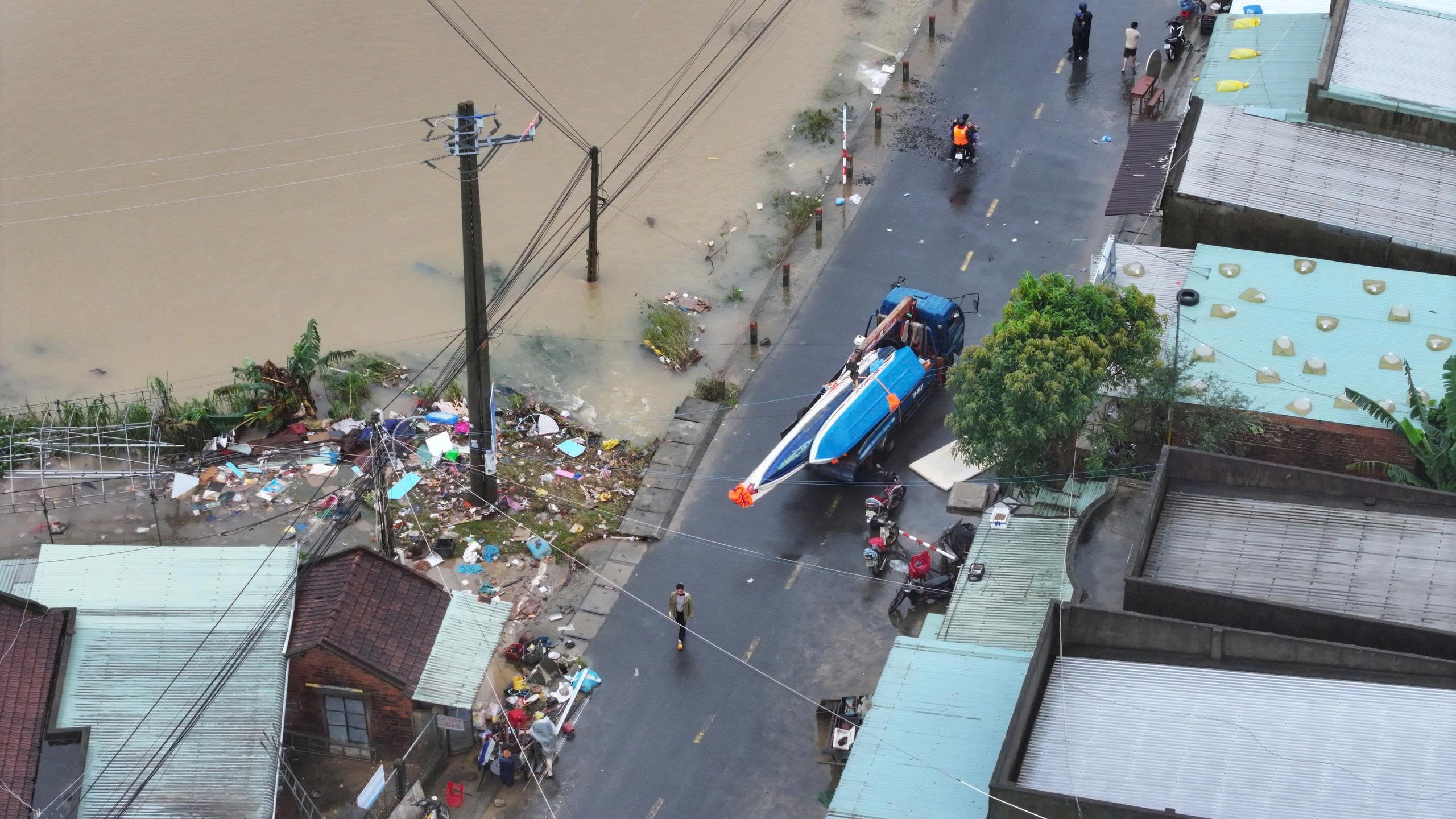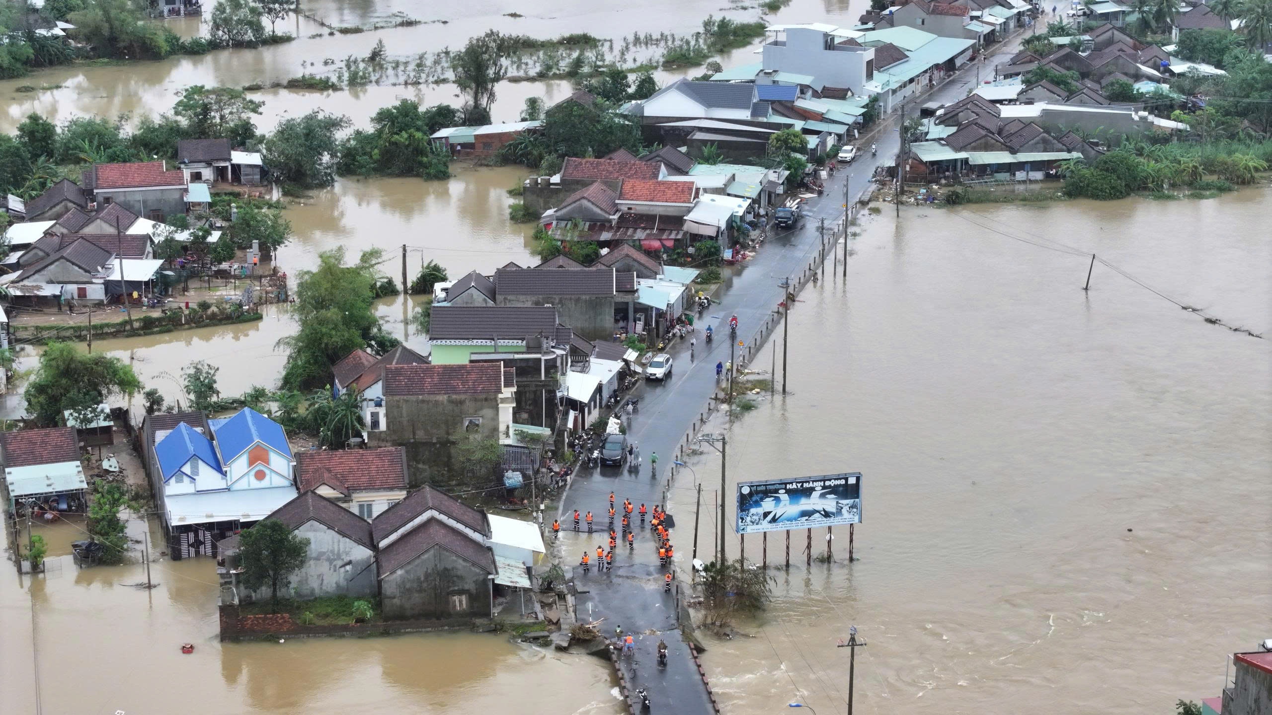 Sau khi mạng xã hội lan truyền thông tin "nhà nghỉ trú lũ sập", "hàng trăm người chết" tại xã Hòa Thịnh, sáng 22/11, ông Lê Chí Hoại, Chủ tịch UBND xã, xác nhận với Tri Thức - Znews đó đều là thông tin bịa đặt. Trước đó, giữa tâm lũ, xã Hòa Thịnh chìm trong biển nước, có nơi ngập sâu 4-5 m khiến việc tiếp cận khó khăn. Tính đến trưa ngày 21/11, toàn bộ hệ thống giao thông vẫn tê liệt, điện thoại mất sóng, người trong vùng lũ chỉ biết ngóng chờ từng chiếc ca nô, thuyền máy xuất hiện giữa dòng nước xoáy. Ảnh: Nghinh Phong Media.