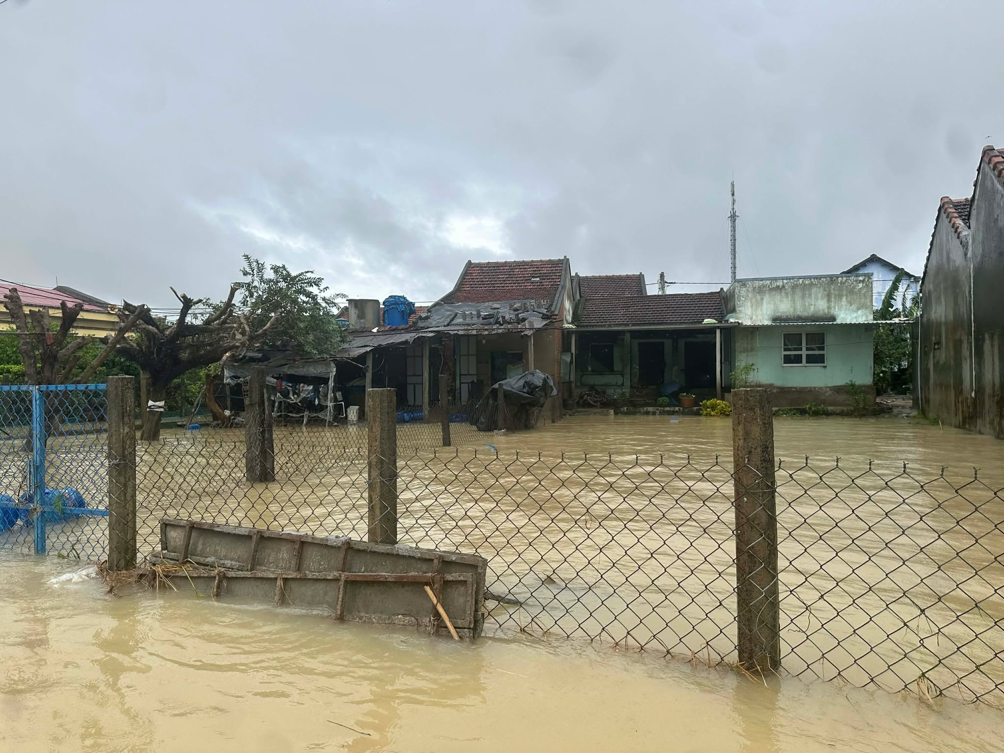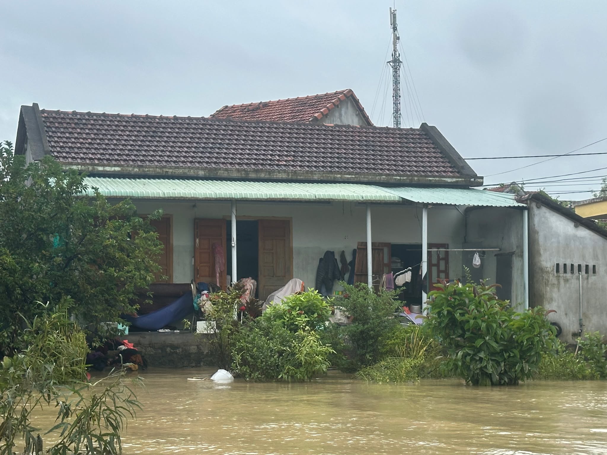 8h30 sáng 22/11 tại sân bay Phù Cát ( tỉnh Bình Định), máy bay Mi-17 thuộc Trung đoàn 930 (Sư đoàn 372) cất cánh, mang theo 3 tấn hàng hóa gồm lương thực, thực phẩm, lương khô, bánh, sữa, nước uống, áo phao… tiếp cận các xã ngập sâu của tỉnh Đắk Lắk để hỗ trợ người dân. Lúc 16h, Long Nhật cho biết trực thăng của quân đội bay vào thả đồ tiếp tế ở địa bàn xã Hòa Xuân. Hiện một số đoạn đường trong xã nước đã rút, người dân có thể di chuyển. Trong khi đó, nhiều ngôi nhà vẫn bị ngập tới sân. Ảnh: Lương Vĩnh Long Nhật.