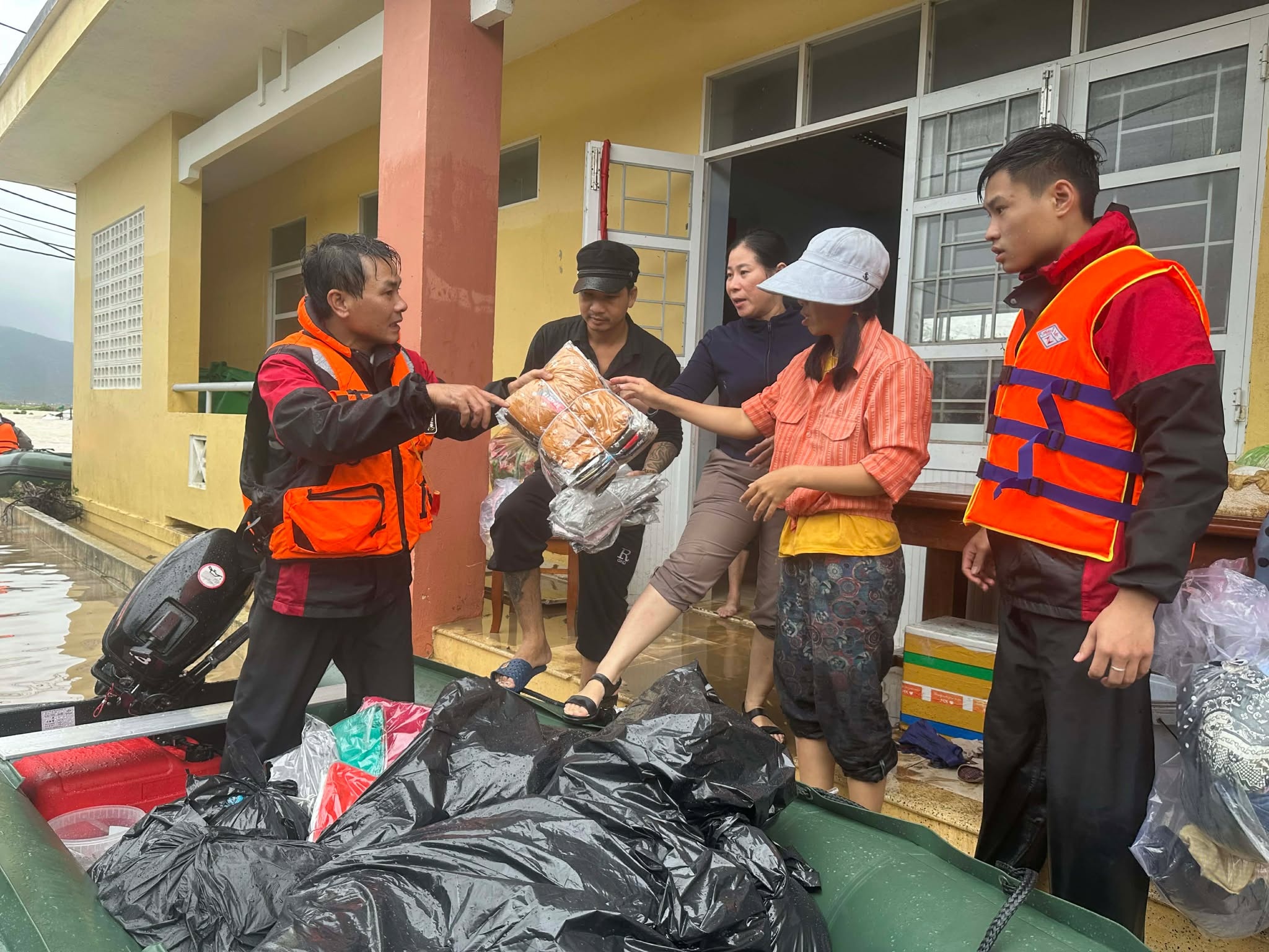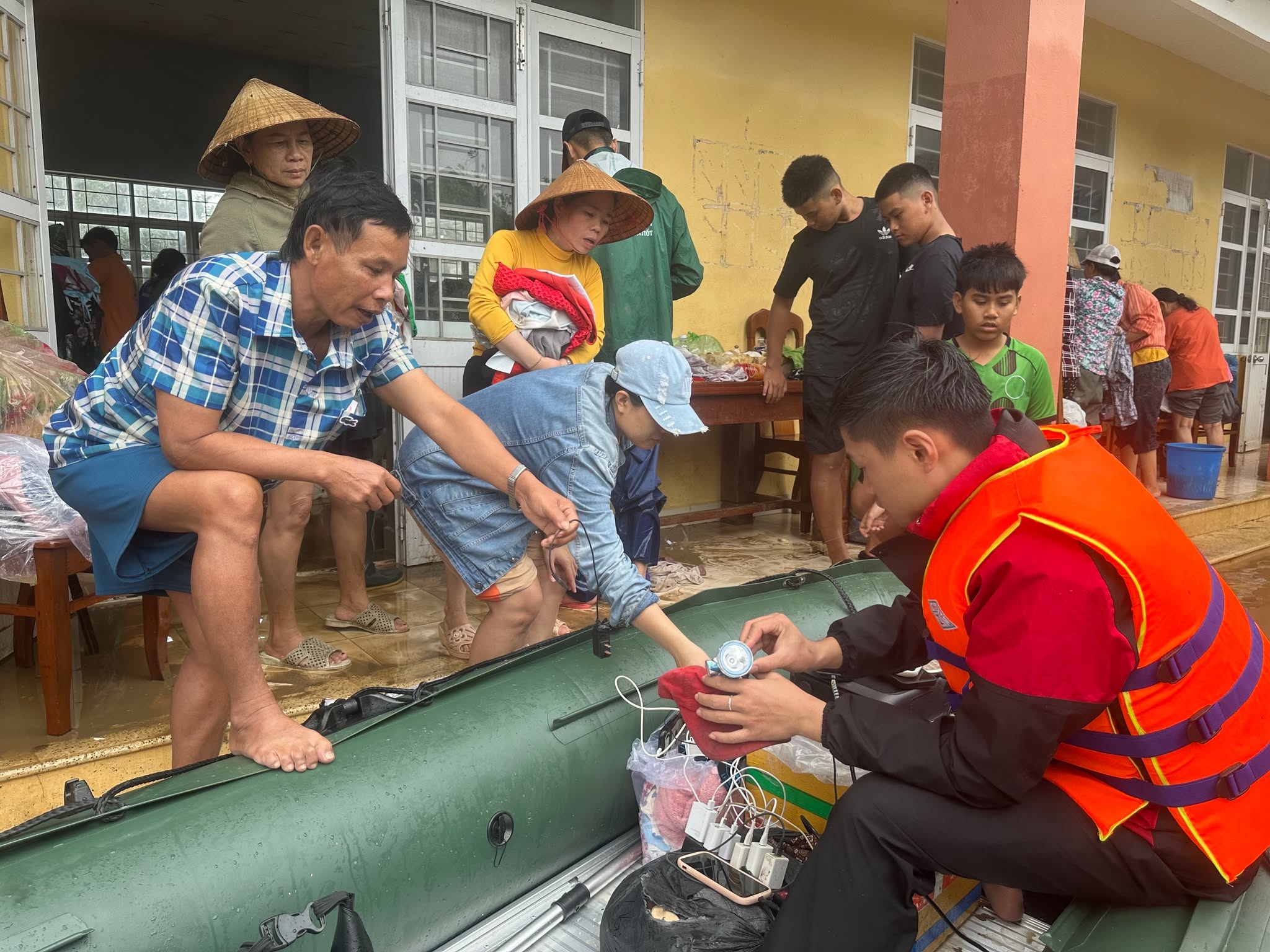 Đây là ngày thứ 4 Long Nhật tham gia cứu hộ trong đợt lũ chưa từng thấy tại miền Trung. Trước đó, vào ngày 19 và 20/11, anh cứu hộ hàng trăm người dân tại Quy Nhơn cũ (nay là tỉnh Gia Lai). Đến xã Hòa Xuân, đội của chàng trai Huế mang giúp đồ cứu trợ như nhu yếu phẩm, đặc biệt là quần áo khô để người dân có đồ thay sau khi bị ngấm nước. Long Nhật cũng mang theo trạm sạc pin di động, giúp người dân sạc điện thoại khi điện vẫn chưa được khôi phục. Ảnh: Lương Vĩnh Long Nhật.