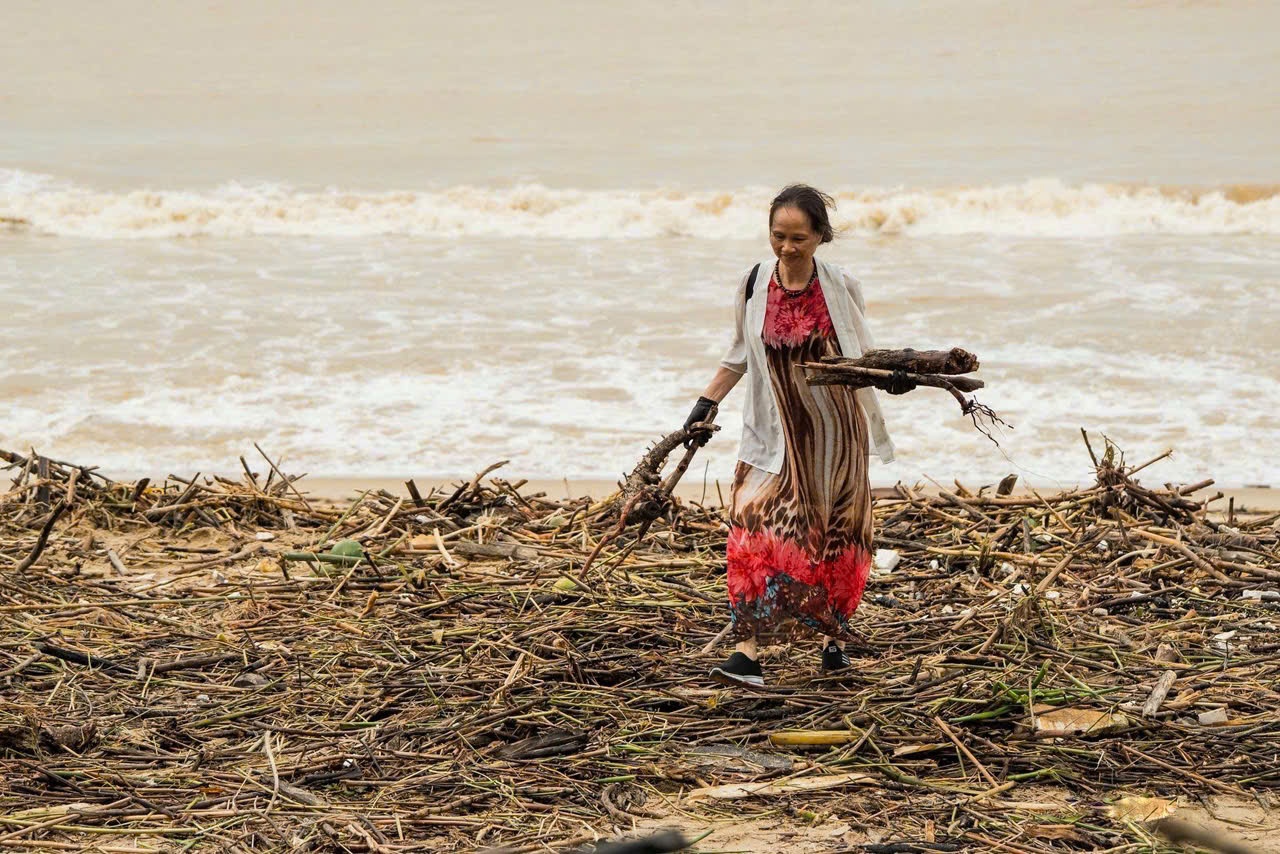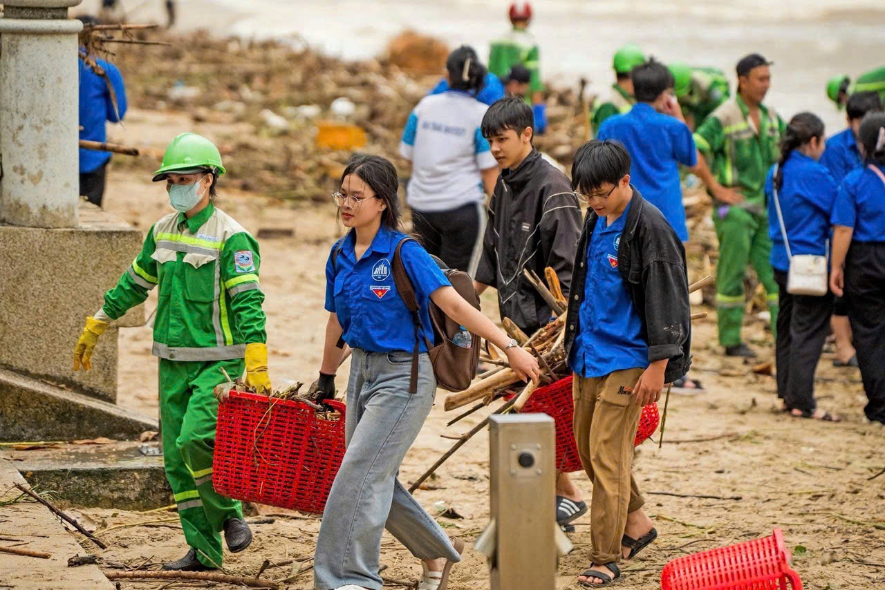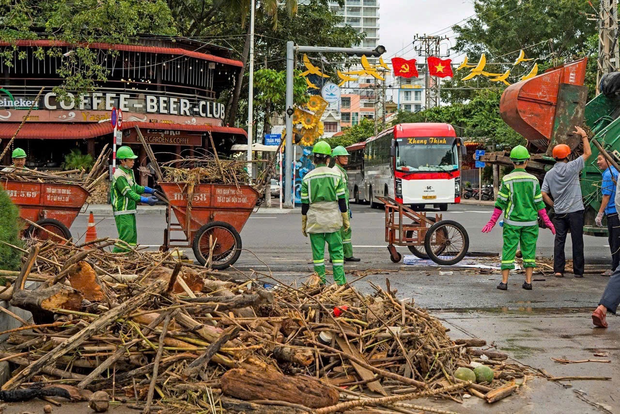 Từ sáng 21/11, khi nước rút tại Nha Trang(tỉnh Khánh Hòa), Công ty đô thị môi trường Nha Trang, các tình nguyện viên và người dân đã cùng nhau dọn rác trên bãi biển, trả lại vẻ đẹp trong lành cho biển Nha Trang sau những ngày mưa lũ. Ảnh: Quỳnh Long Hải.