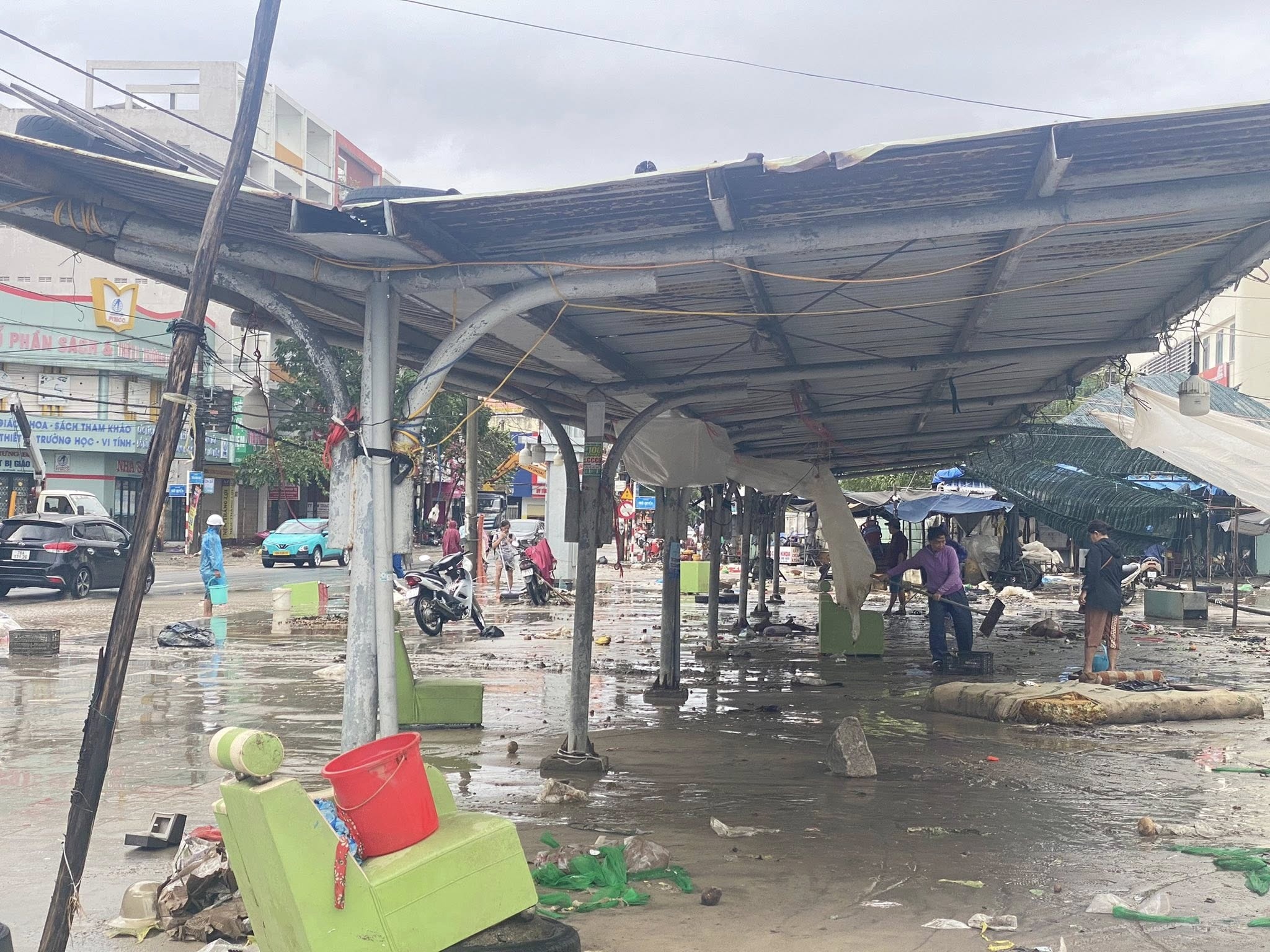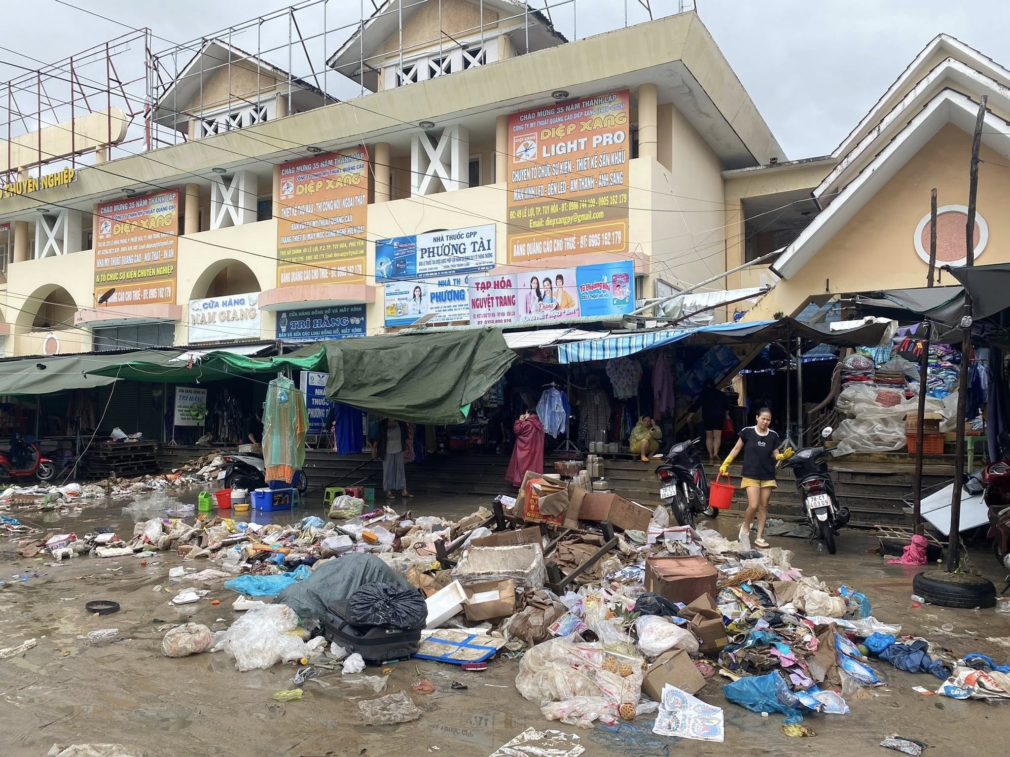 Ngay khi nước rút, nhiều tiểu thương và người dân xung quanh đã tiến hành dọn rác, sắp xếp lại hàng hóa. Ảnh: Tropical Trip Phú Yên.