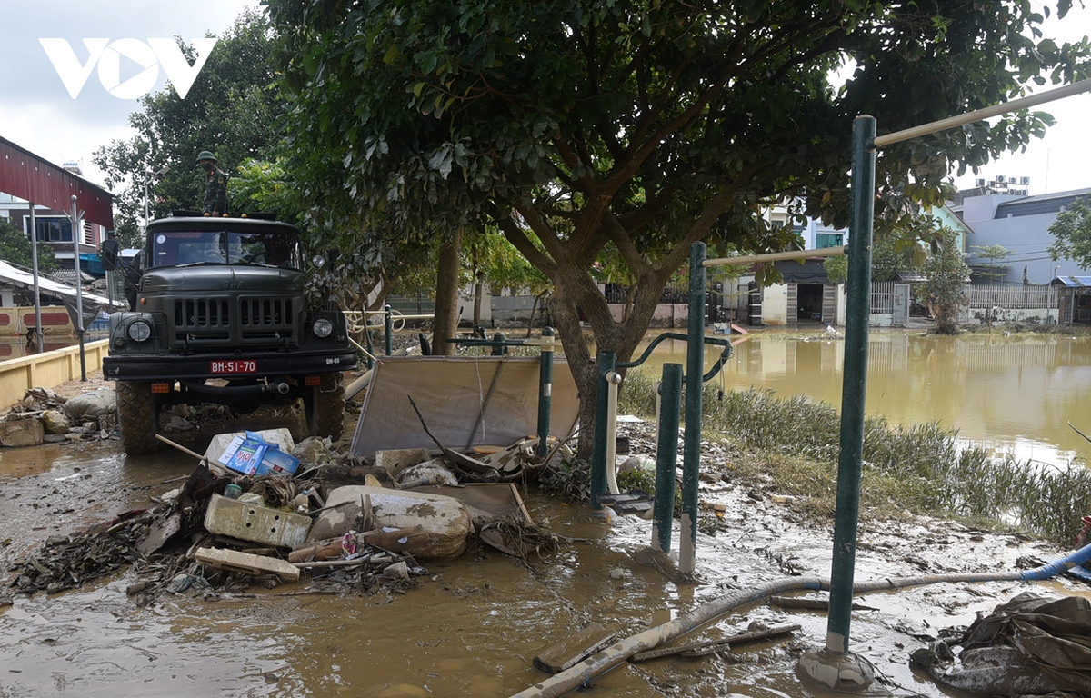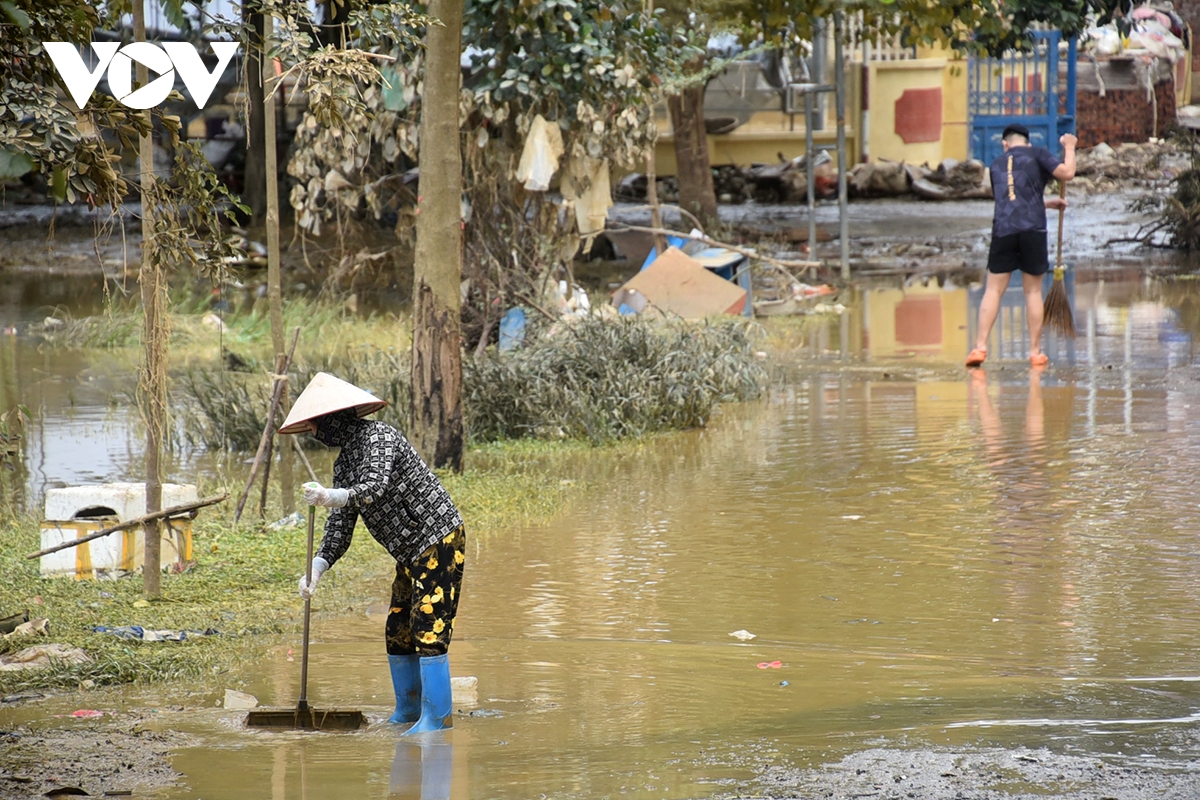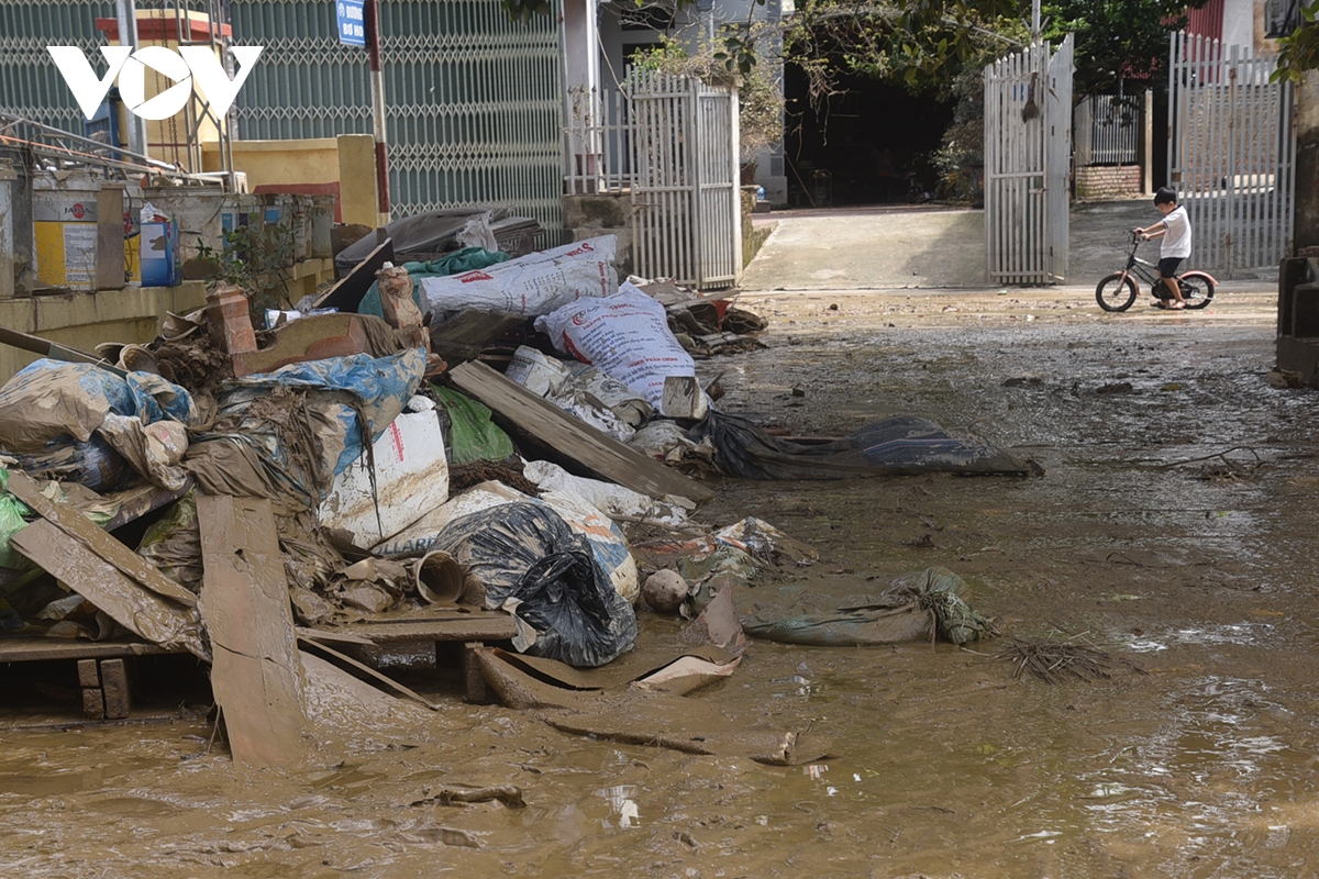 Rác và bùn đất phủ dày đặc khắp nơi, để lại cảnh hoang tàn sau lũ.