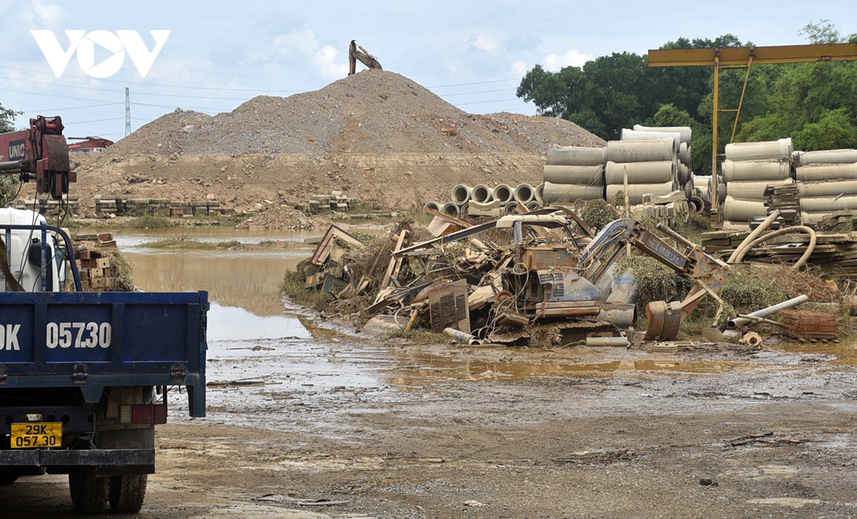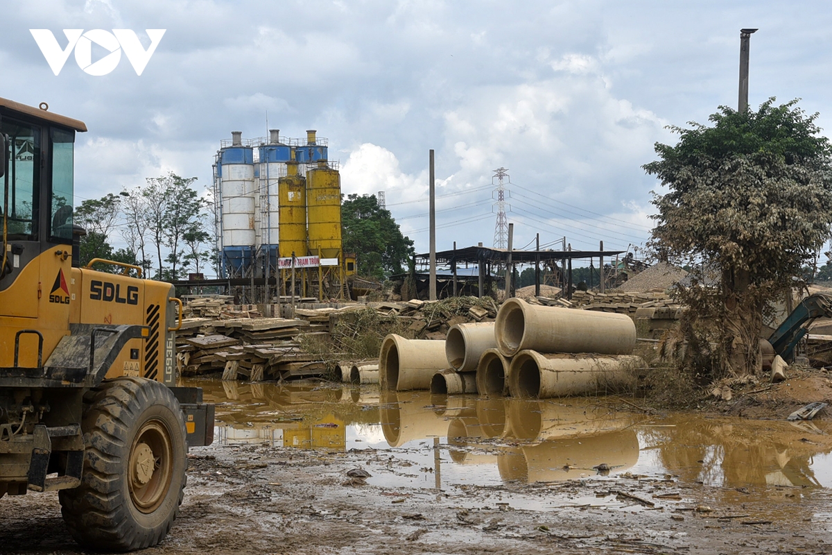 Nước rút để lại lớp bùn đất dày đặc phủ kín trạm sản xuất bê tông ở thôn An Lạc, xã Trung Giã, Hà Nội.