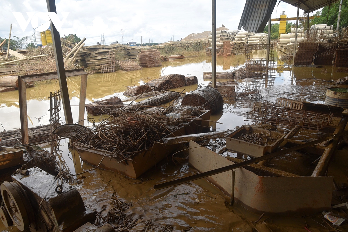 Anh Nguyễn Văn Hồng, chủ cơ sở trạm bê tông cho biết, đỉnh điểm lũ gây nước ngập cao 5m vượt mái nhà, tài sản máy móc thiết bị chủ yếu là đồ điện, mô tơ bị thiệt hại. Để hoạt động lại phải mất thời gian khắc phục ít nhất từ nửa tháng đến 1 tháng