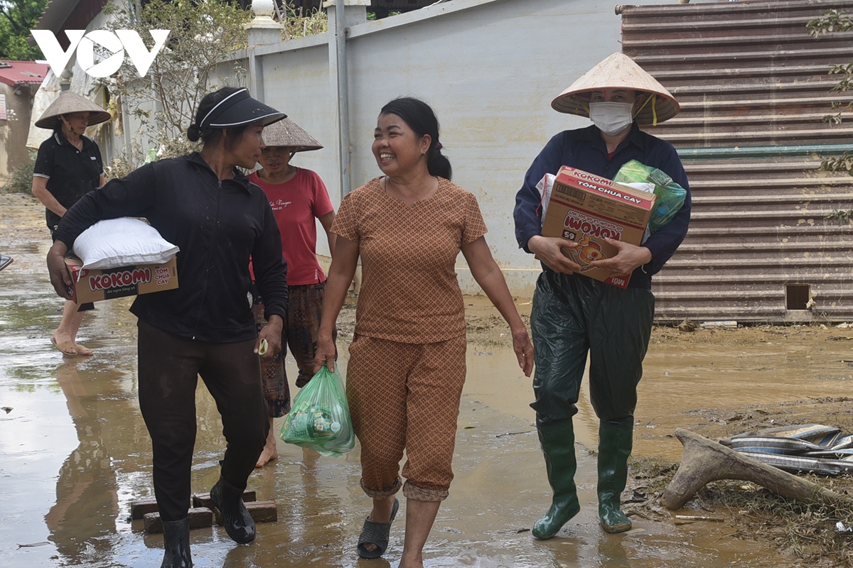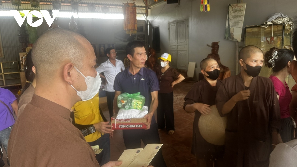 Dù còn bộn bề ngổn ngang sau lũ, chùa An Lạc phối hợp đoàn từ thiện trao quà cứu trợ gồm mì tôm, gạo, nước sạch, sữa và tiền mặt cho bà con vùng lũ.