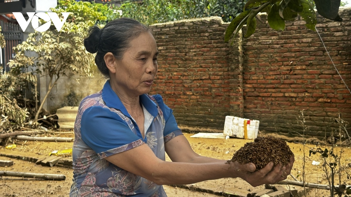 Tranh thủ trời nắng, bà Nguyễn Thị Hồng tại thôn Hòa Bình, xã Trung Giã mang thóc ra phơi. Bà Hồng cho biết: "Đến hôm nay điện, nước chưa được cấp lại. Máy phát điện ngập nước, dù trước đó đã bọc bạt treo lên xà ngang ở hiên. Giờ phải thuê thợ sửa để có nước rửa thóc. Thóc mọc mầm thối hết cả. Chưa bao giờ tôi thấy trận lụt nào như thế này, không nghĩ nó to như thế. Trận lụt bão số 3 năm ngoái thóc bỏ hòm để ngoài hiên nước không tới, trận lụt này nước lên cao hỏng hết. Thóc mọc mầm bốc mùi thối chỉ để cho gia súc, gia cầm ăn".