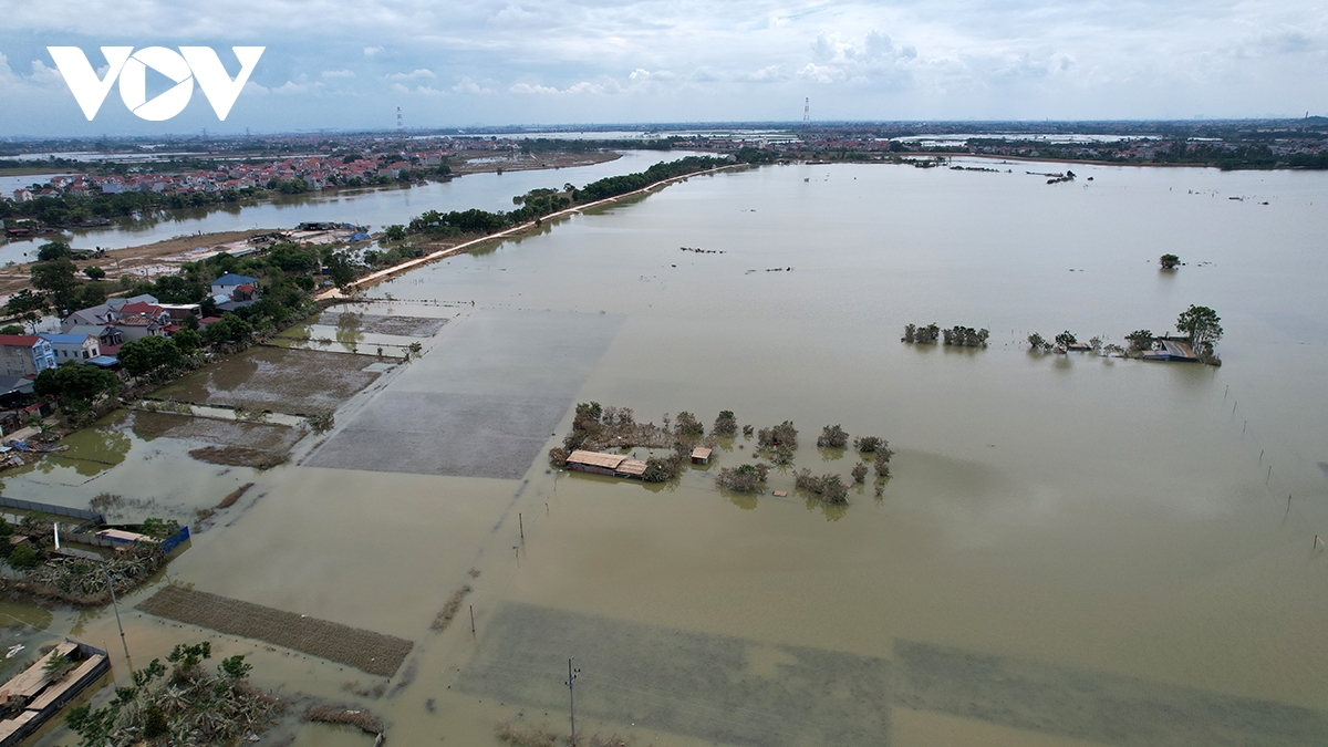Tại thôn An Lạc, nước rút dần, những ruộng lúa hiện ra dưới làn nước đục.