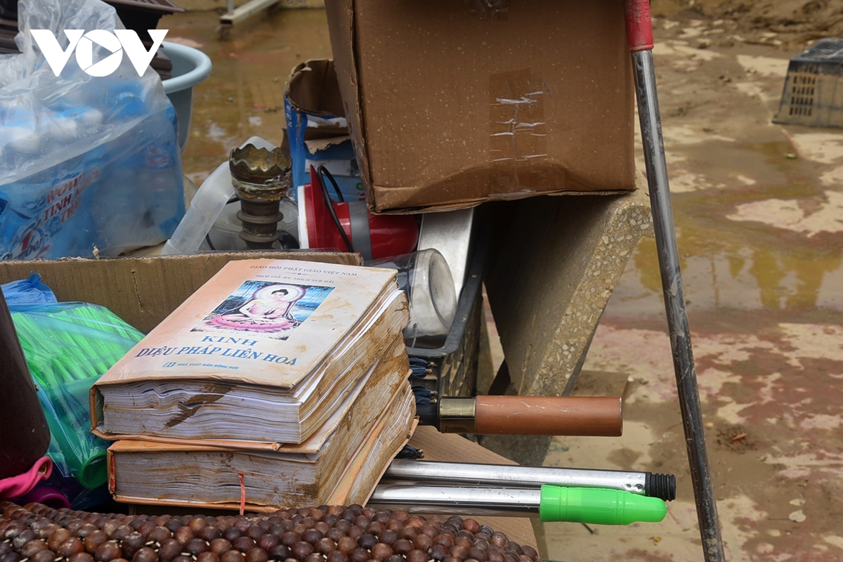 Tại chùa An Lạc, sau lũ ngổn ngang đồ thờ, sách kinh phật bị ngấm nước, lấm bùn đất và hư hỏng