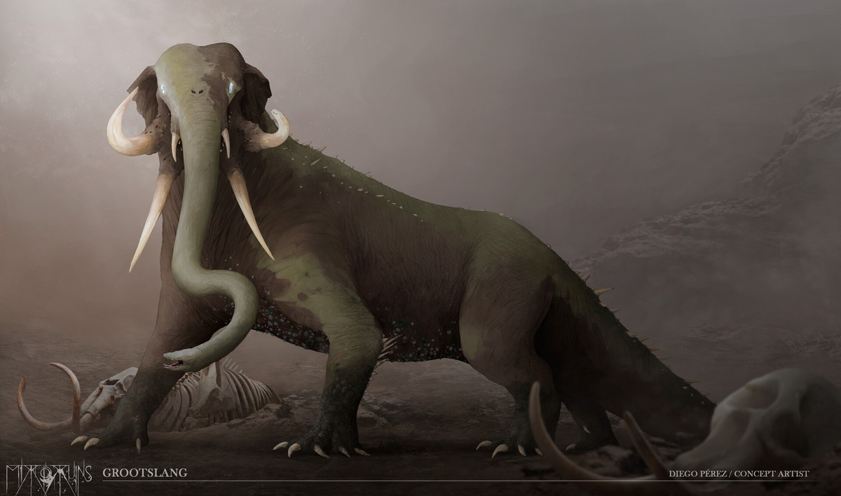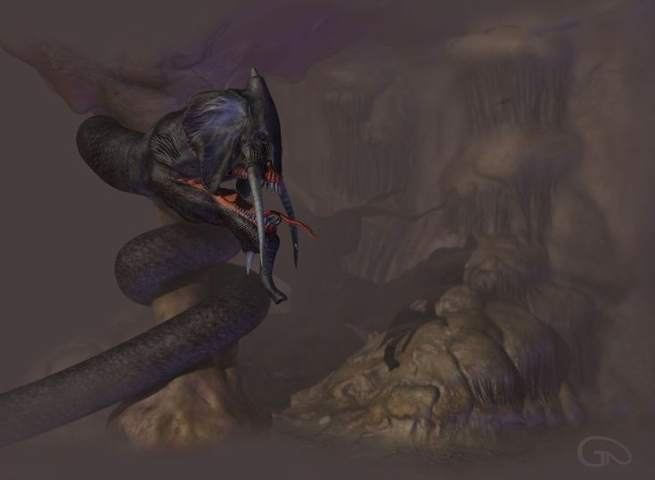 Rắn lai voi. Người xưa tin rằng Grootslang có hình dáng rắn kết hợp với voi và thông minh như voi. Sở hữu trí tuệ vượt trội, nó có thể dụ hoặc hù dọa con người xâm nhập lãnh thổ của nó. Ảnh: artstation.com.