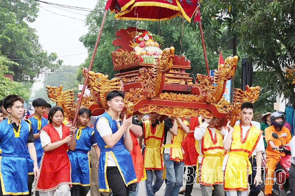 Lễ rước kiệu thu hút nam thanh, nữ tú của làng tham gia với không khí sôi động và đầy hứng khởi.