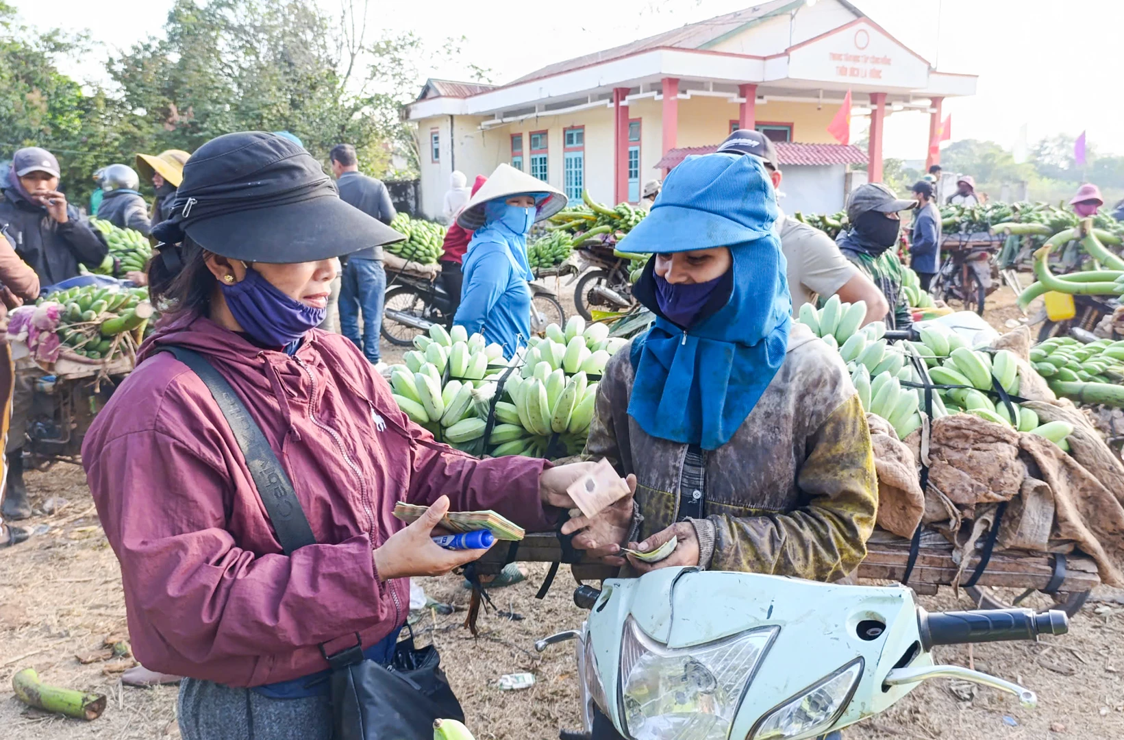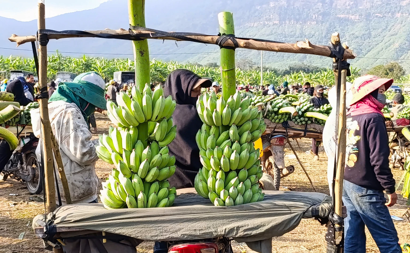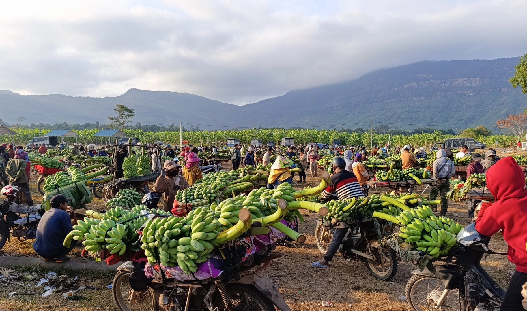 Từ sáng sớm, từng đoàn xe gắn máy nối đuôi nhau đổ về khu vực họp chợ. Chuối được xếp thành từng buồng lớn, phủ bạt, kê cao hoặc đặt lên giá tạo nên sự rộn ràng cho không khí ngày Tết nơi biên cương.