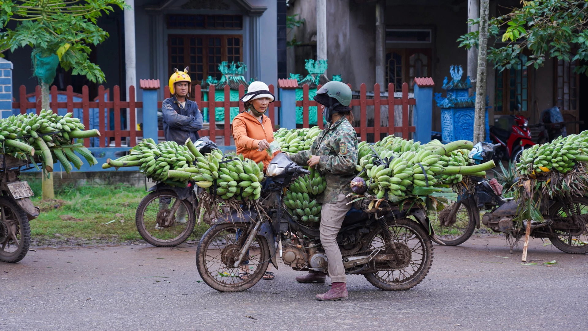 Chị Nguyễn Thị Bốn (bìa trái) chọn mua chuối để đưa ra các địa phương khu vực phía Bắc Quảng Trị tiêu thụ.