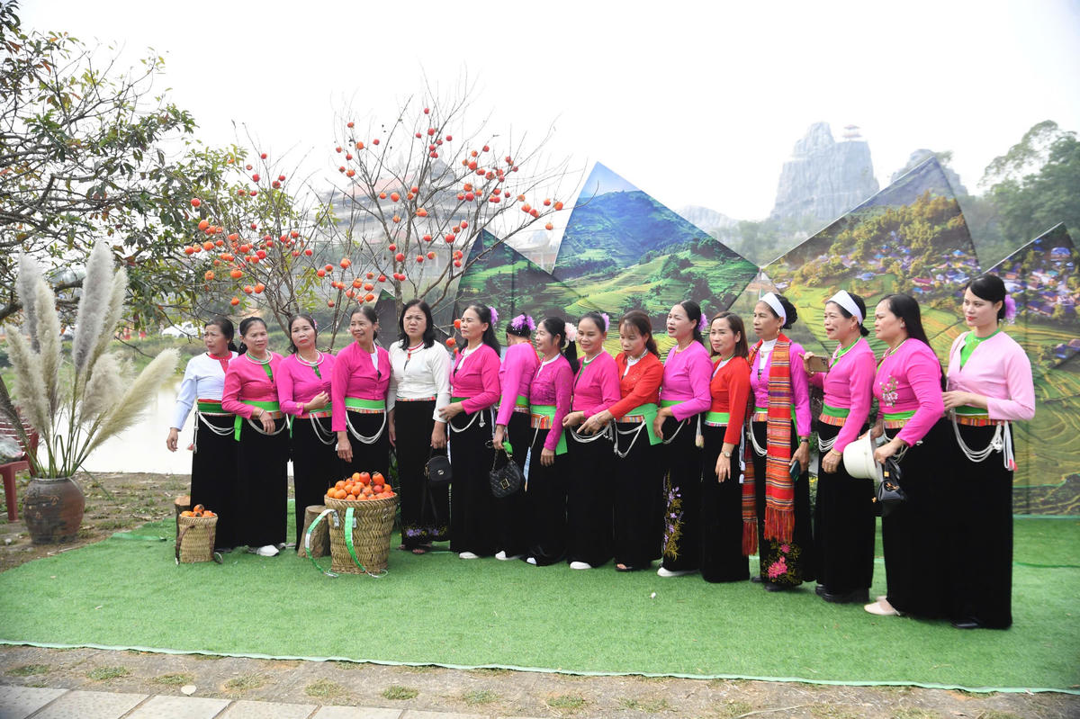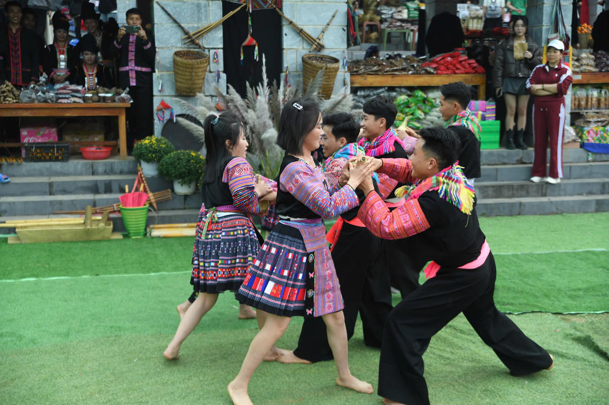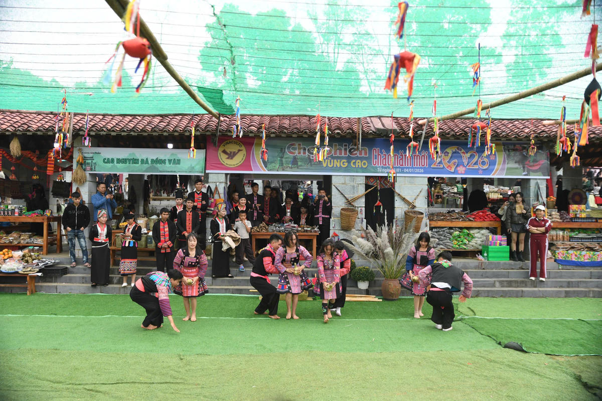 Không gian phiên chợ vùng cao trong chương trình “Chào năm mới 2026” tái dựng sinh động đời sống và bản sắc văn hóa nơi miền sơn cước, mang đến trải nghiệm giàu màu sắc cho người tham quan. Ảnh: Phạm Sỹ.