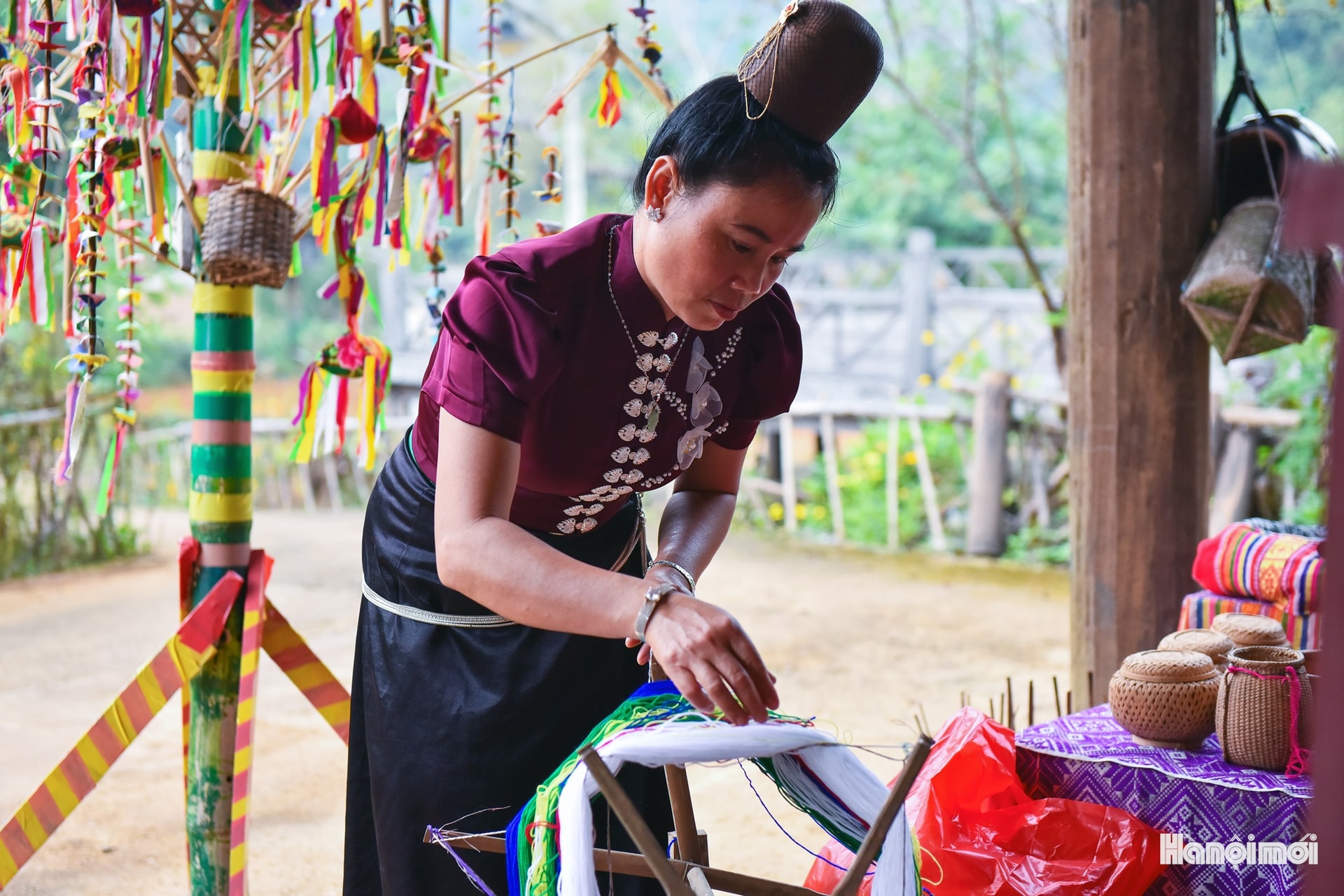Nghề dệt truyền thống được trình diễn ngay tại phiên chợ.