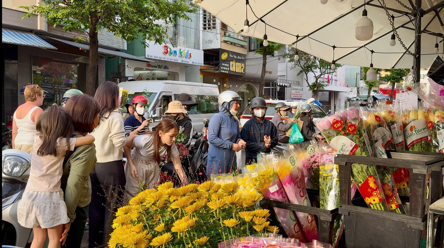 Giữa sắc vàng, sắc đỏ rực rỡ, nhiều gia đình không chỉ mua hoa mà còn dành thời gian dạo chợ, chụp hình, tận hưởng không khí.