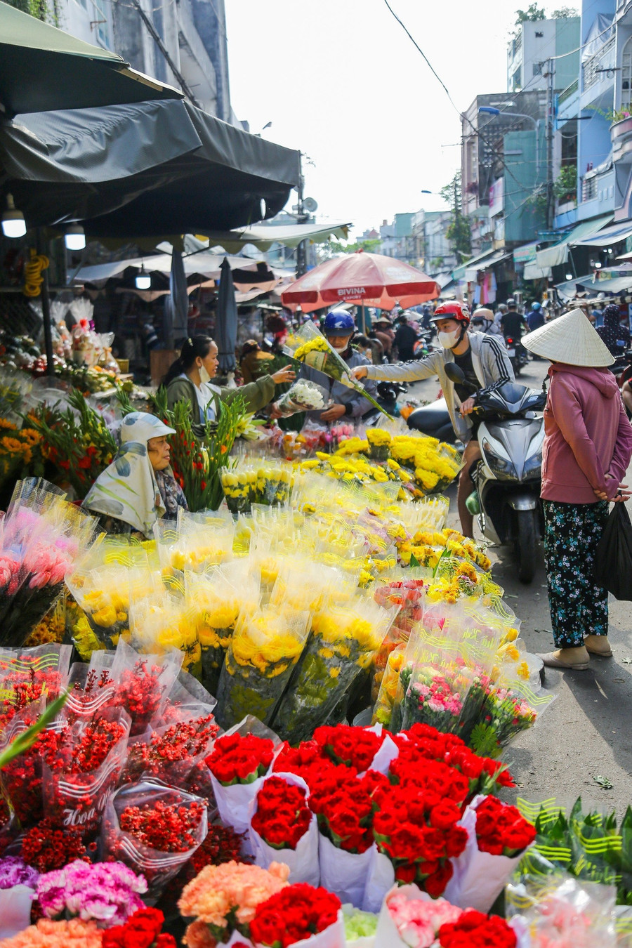 Tại các chợ truyền thống ở khu vực Quy Nhơn, mai vàng, cúc đại đóa, cúc mâm xôi… ngập tràn các cung đường. Người bán tưới nước, chỉnh lại thế cây; người mua lựa chọn kỹ lưỡng.