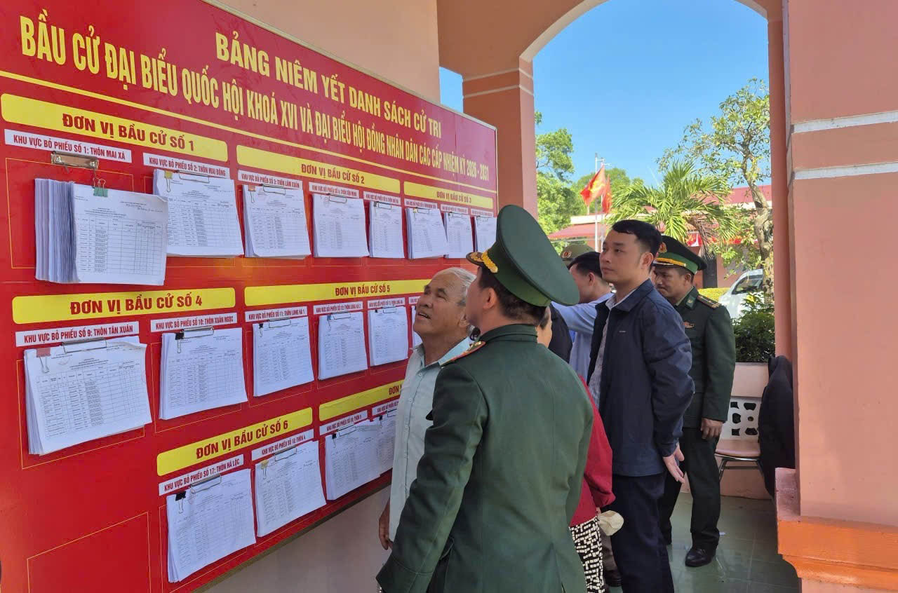 Cán bộ Đồn Biên phòng cửa khẩu cảng Cửa Việt cùng cử tri xã Cửa Việt, tỉnh Quảng Trị xem danh sách cử tri được niêm yết tại một điểm bầu cử