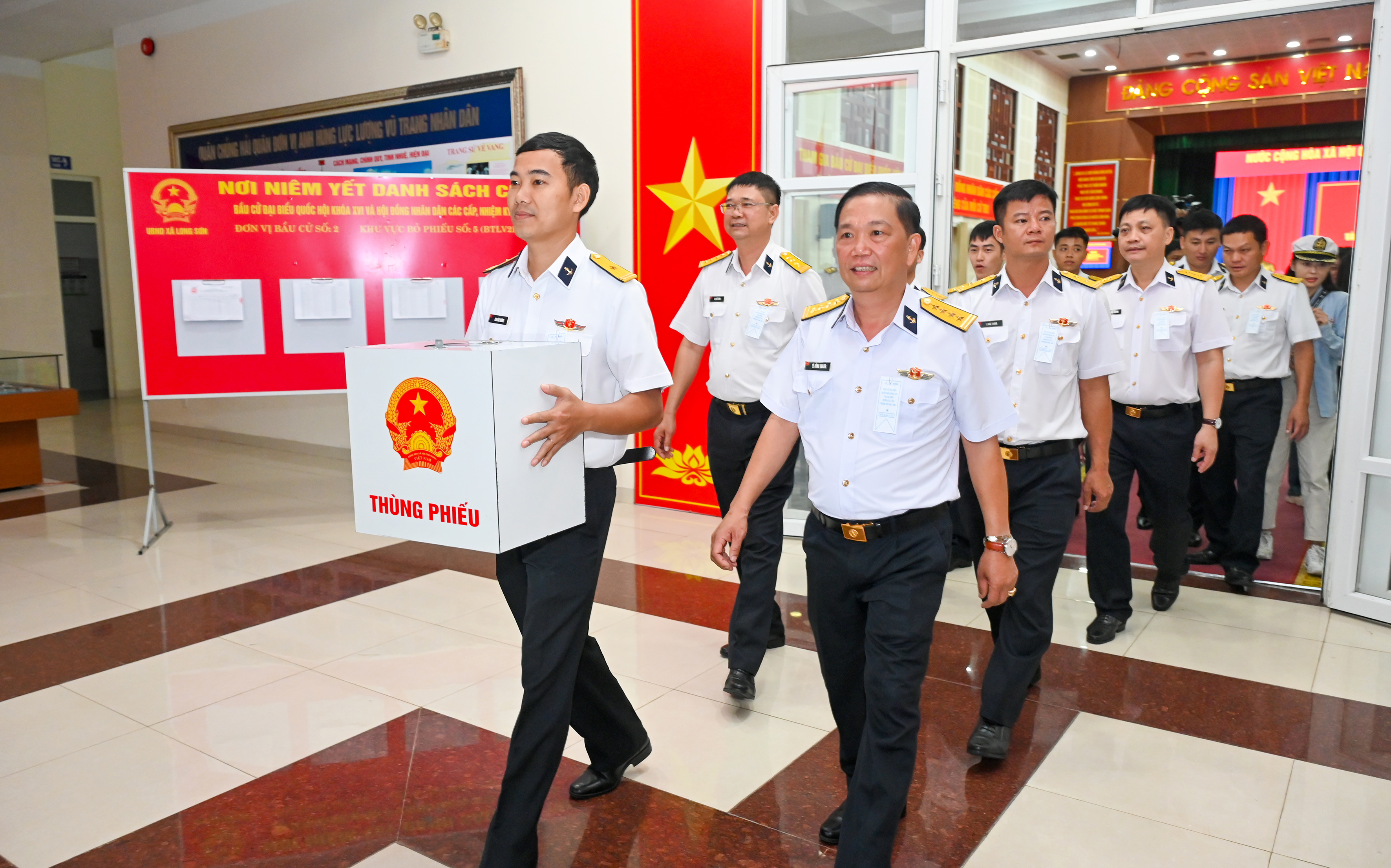 Cán bộ, chiến sĩ Bộ Tư lệnh Vùng 2 Hải quân đưa thùng phiếu ra các tàu phục vụ công tác bầu cử (ẢNH: PHƯƠNG THÚY)