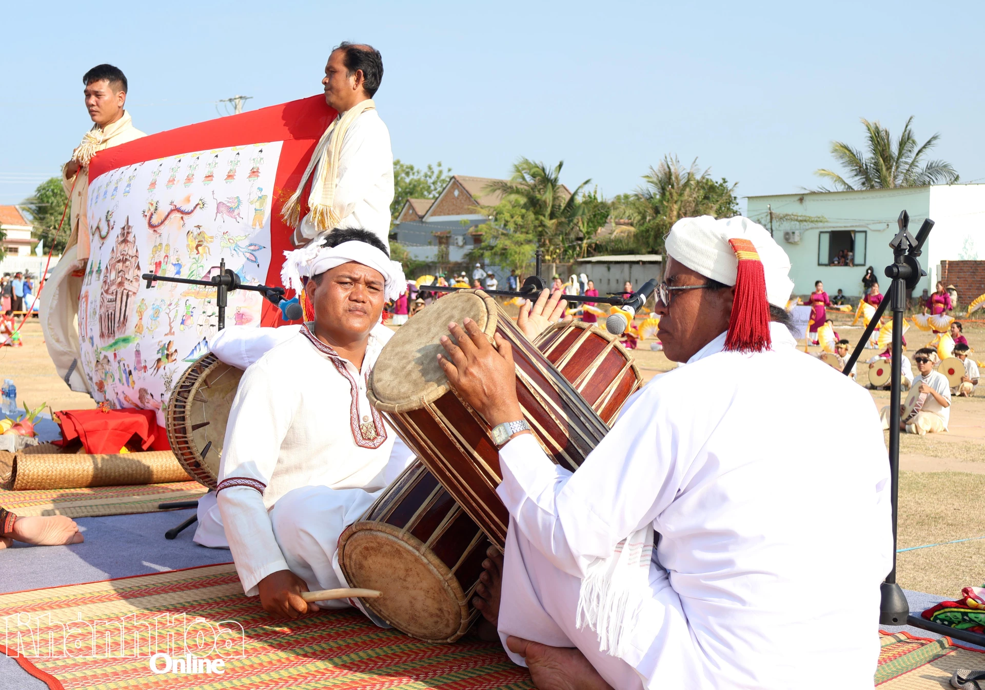 Các điệu múa và hoạt cảnh diễn ra trên nền nhạc trống Ghinăng, trống Paranưng và kèn Saranai.
