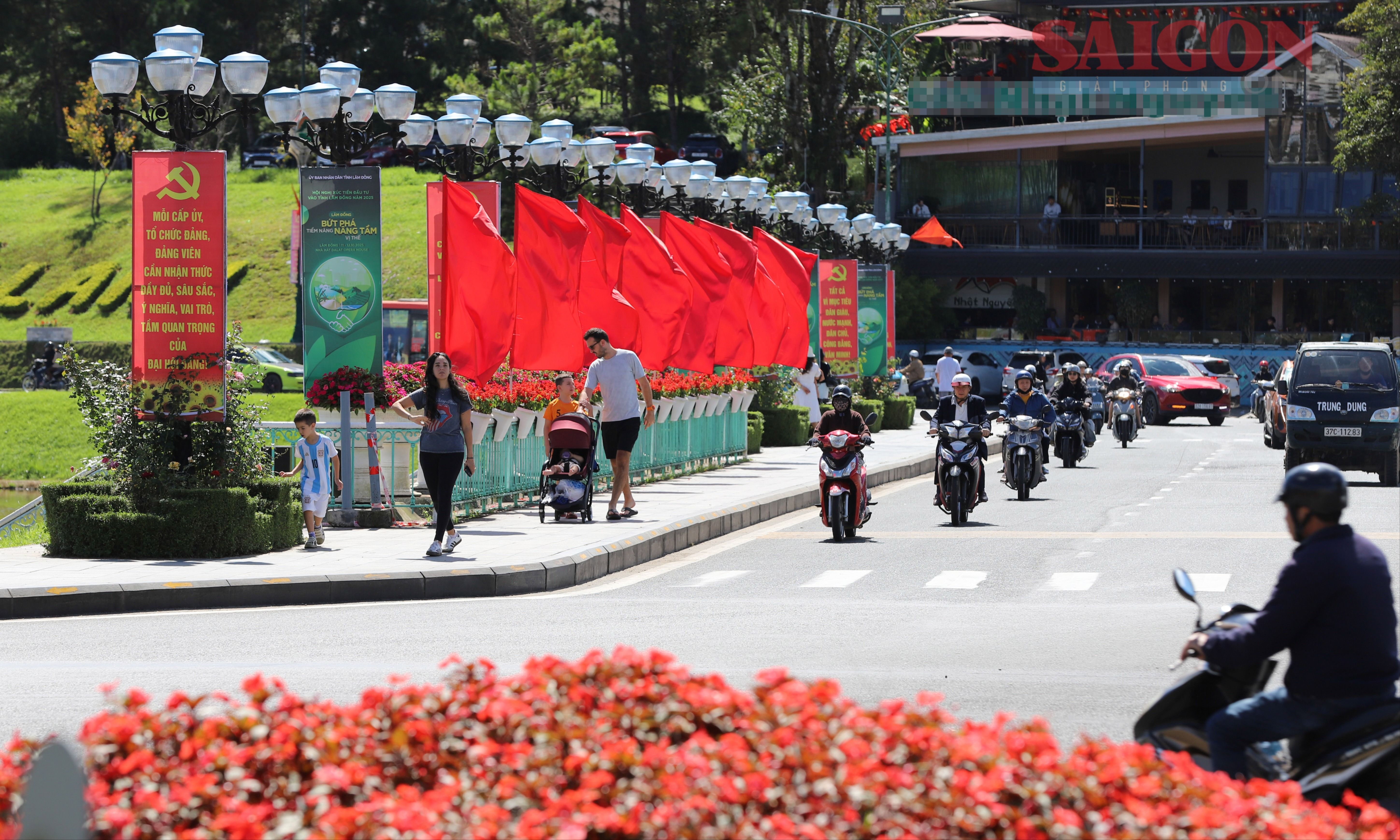 Đường Lê Hồng Phong, phường Xuân Hương – Đà Lạt được trang hoàng cờ đỏ chào mừng đại hội. Ảnh: ĐOÀN KIÊN