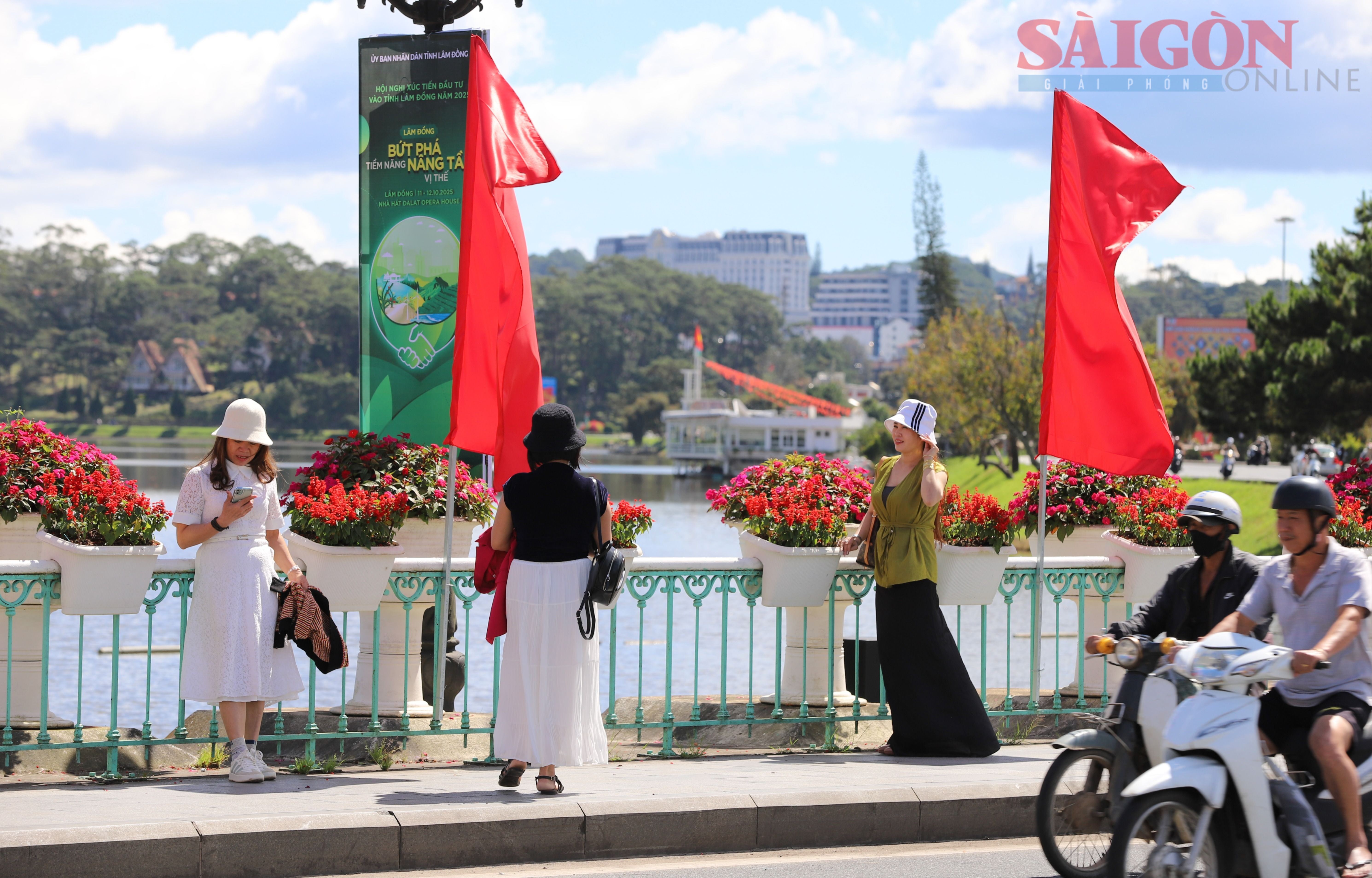 Tương tự, khu vực cầu ông Đạo (hồ Xuân Hương) cũng được trang trí nhiều cờ, hoa. Ảnh: ĐOÀN KIÊN