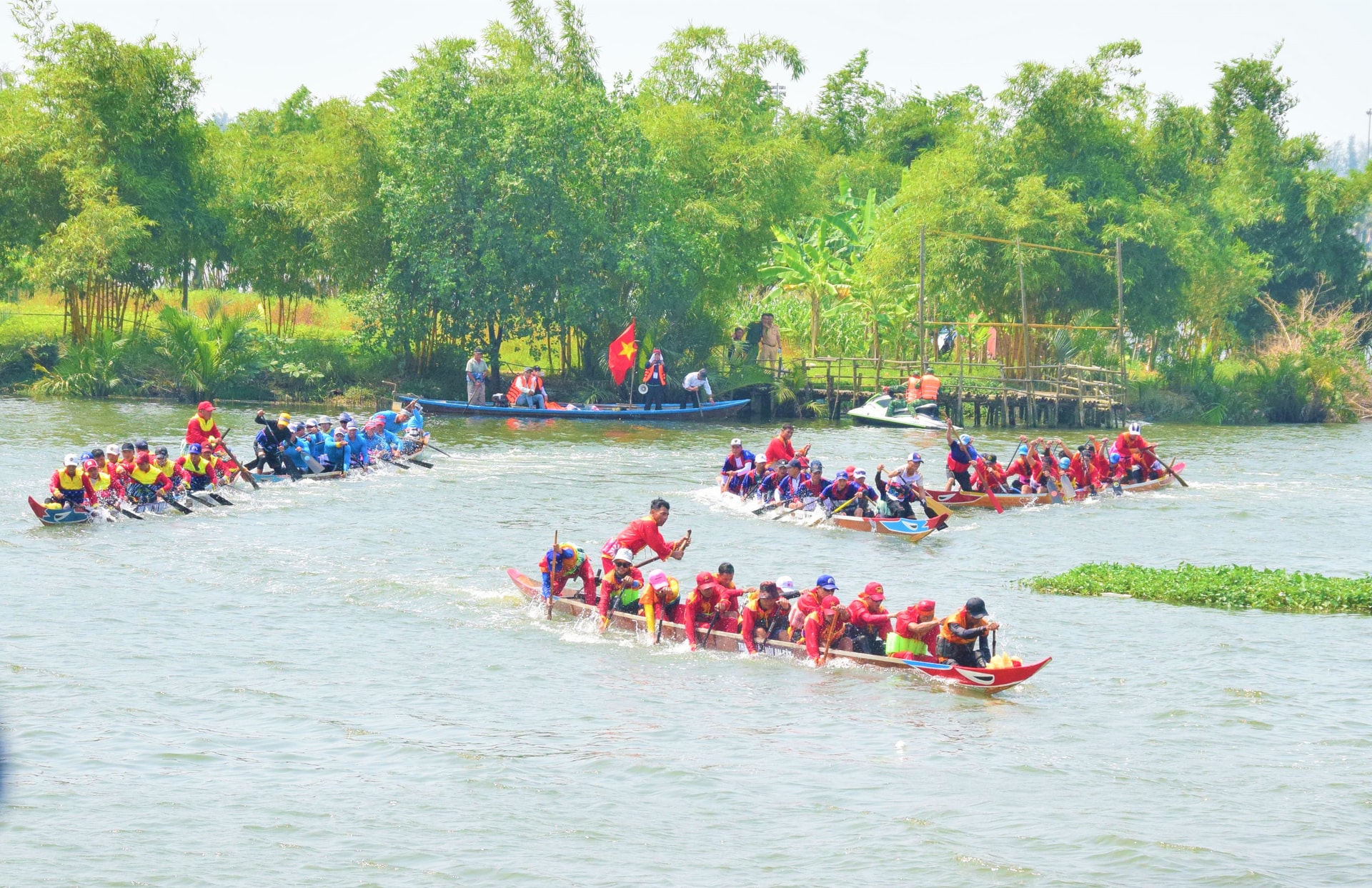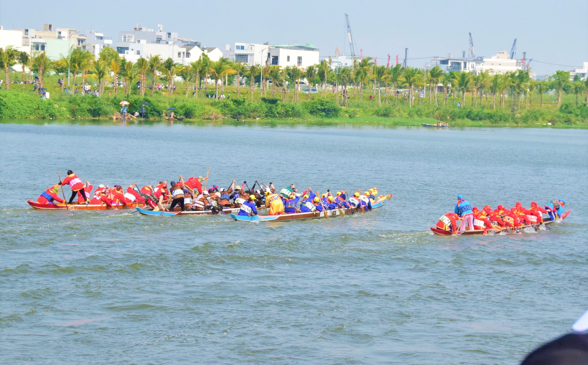 Các thuyền đua nam tranh tài sôi nổi trên sông Cổ Cò. Ảnh: PHI NÔNG
