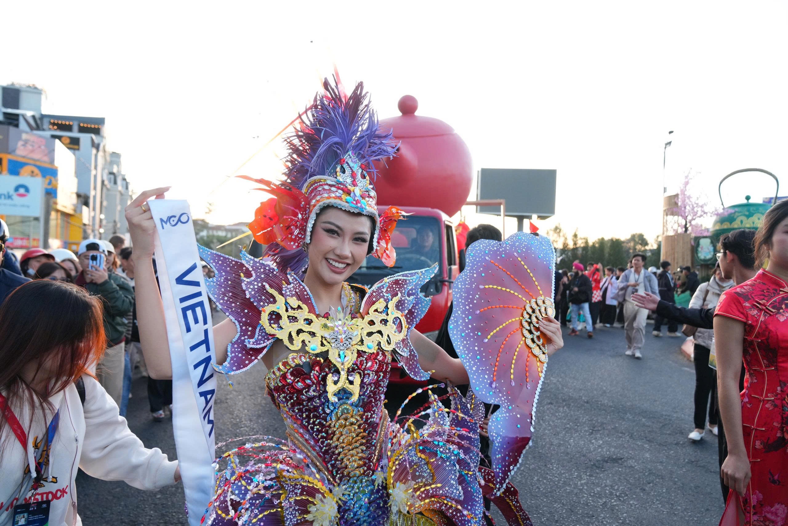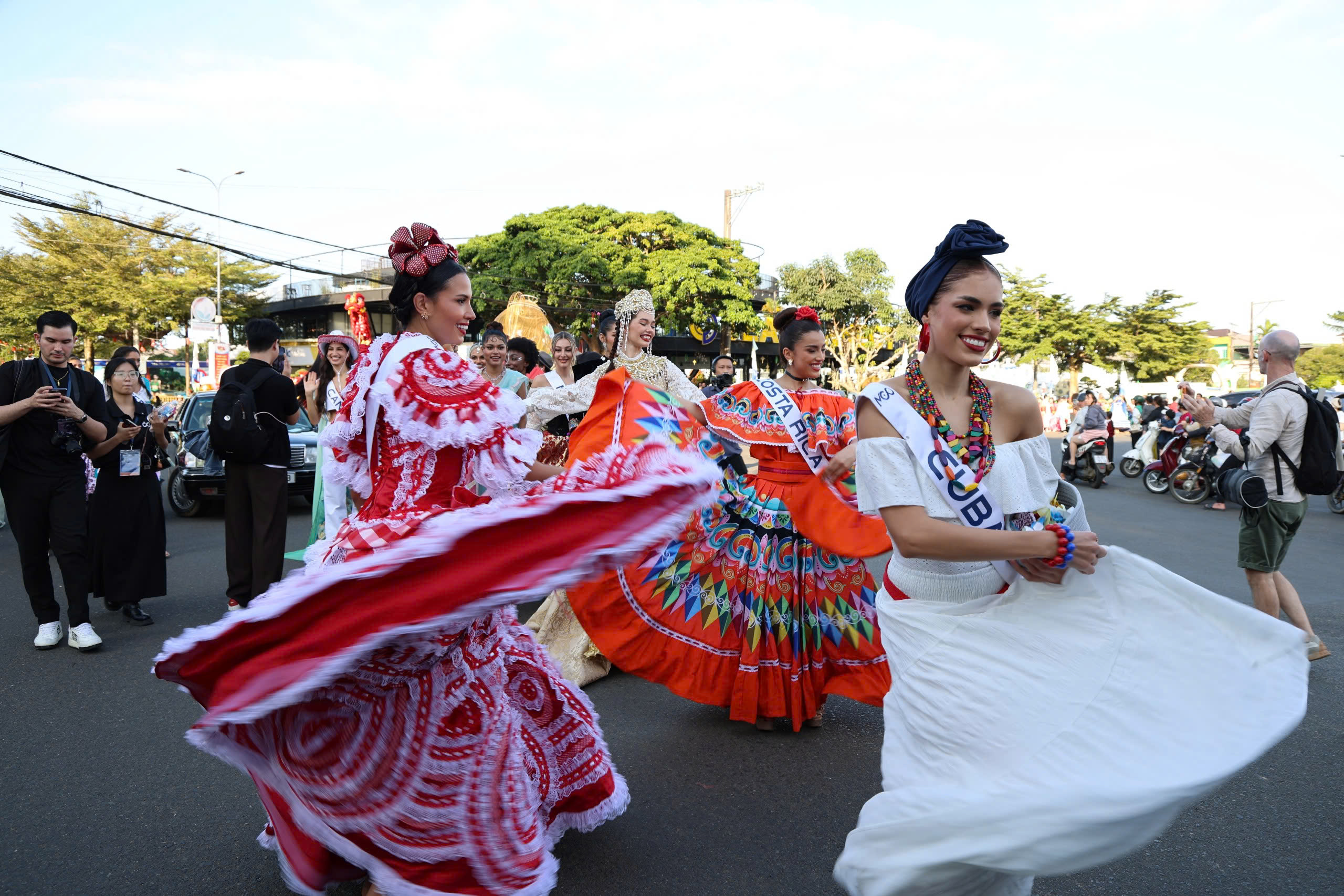 Trước đó, các thí sinh Miss Cosmo trong trang phục truyền thống rực rỡ diễu hành trên tuyến phố chính tại các phường, xã ở TP Bảo Lộc trước đây, thu hút đông đảo người dân và du khách theo dõi
