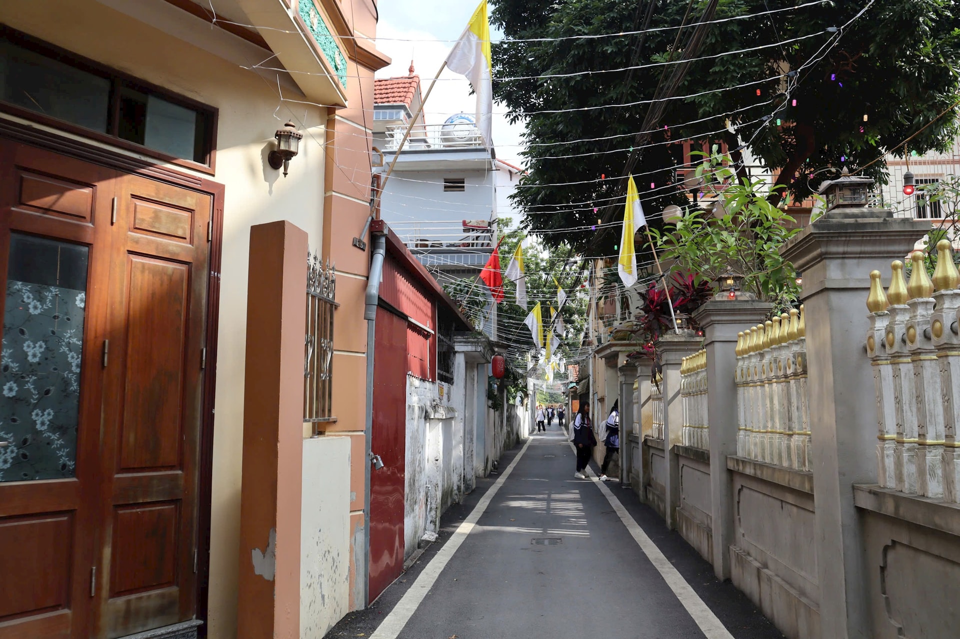Chiều 24-12, khi hoàng hôn buông xuống, giáo họ Đại Thần (xã Đan Phượng) như khoác lên mình chiếc áo mới. Khuôn viên nhà thờ rực sáng ánh đèn, hang đá được dựng công phu, điểm xuyết hoa tươi và những dải đèn nháy lung linh. Trên các con đường làng, từng mái nhà, cổng ngõ được trang trí cờ hoa, tạo nên khung cảnh làng quê vừa yên bình, vừa rộn ràng sắc màu lễ hội.