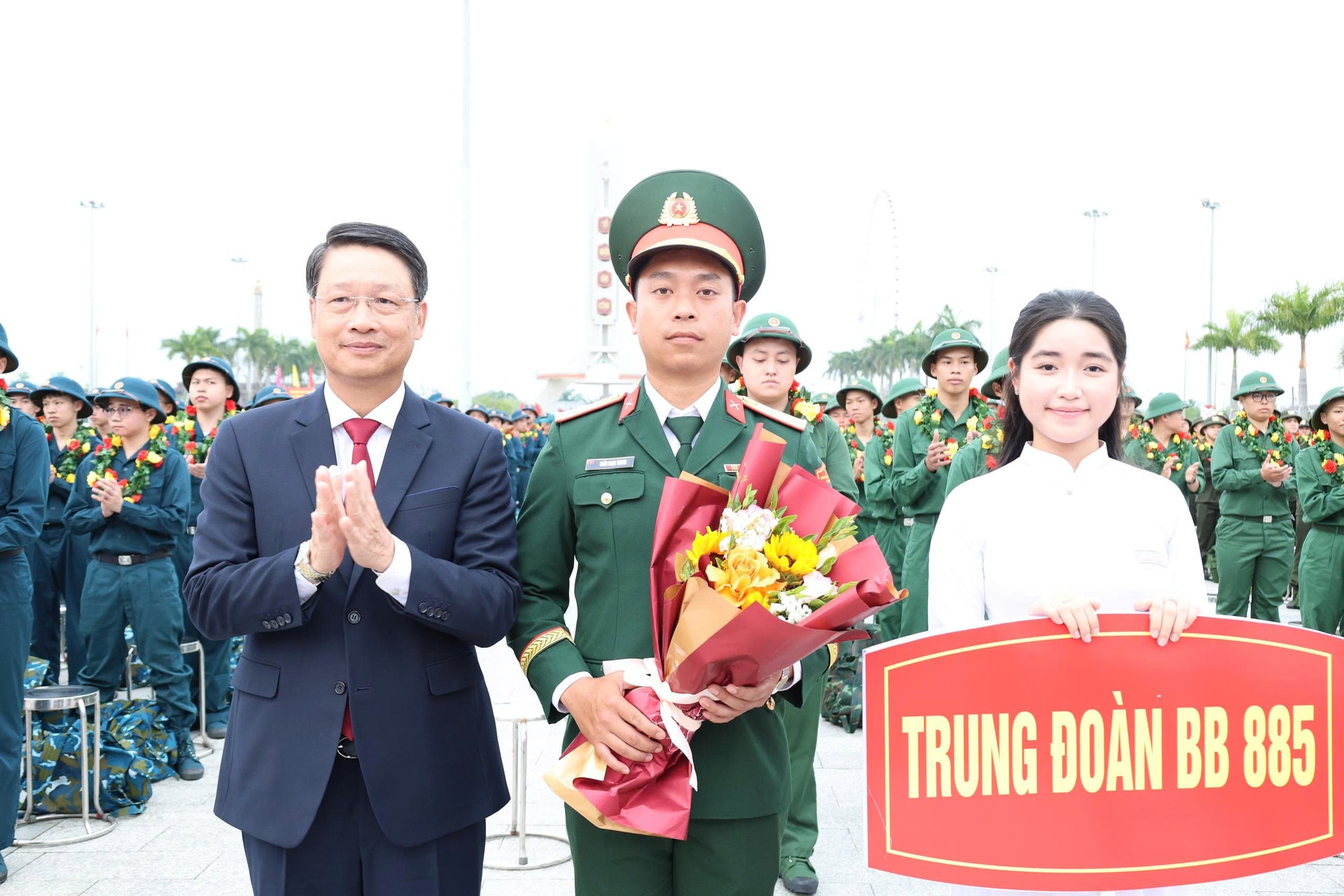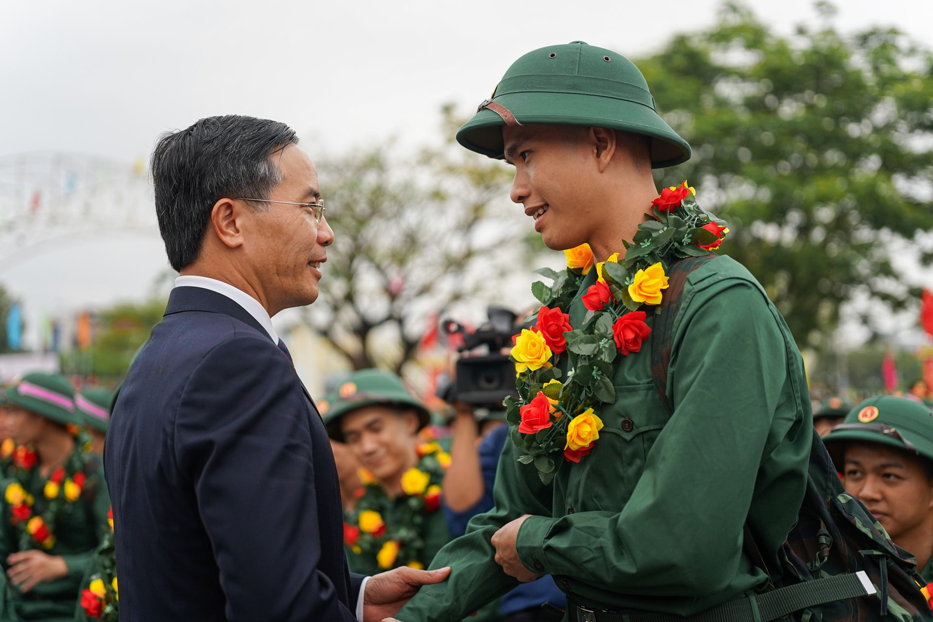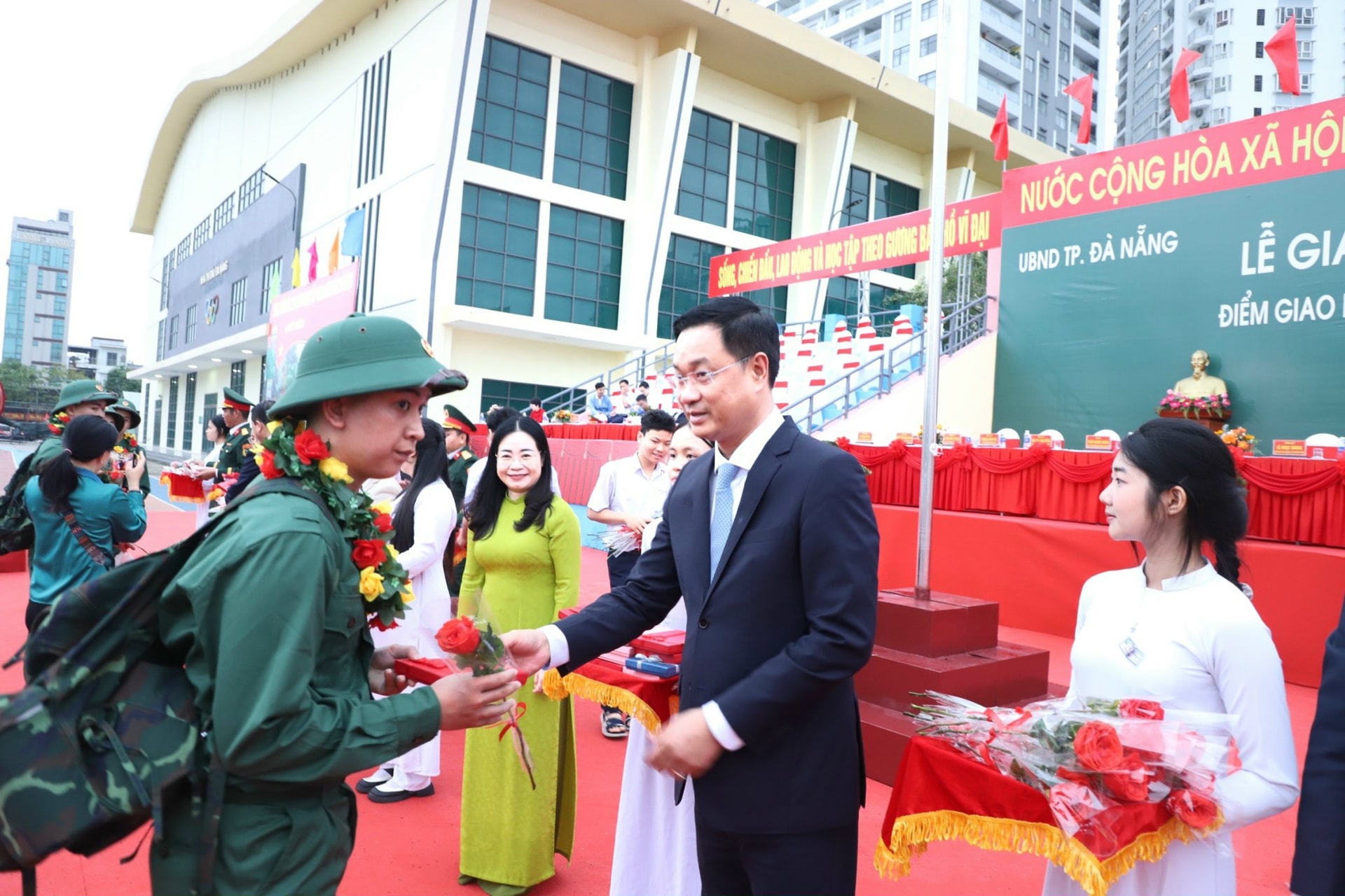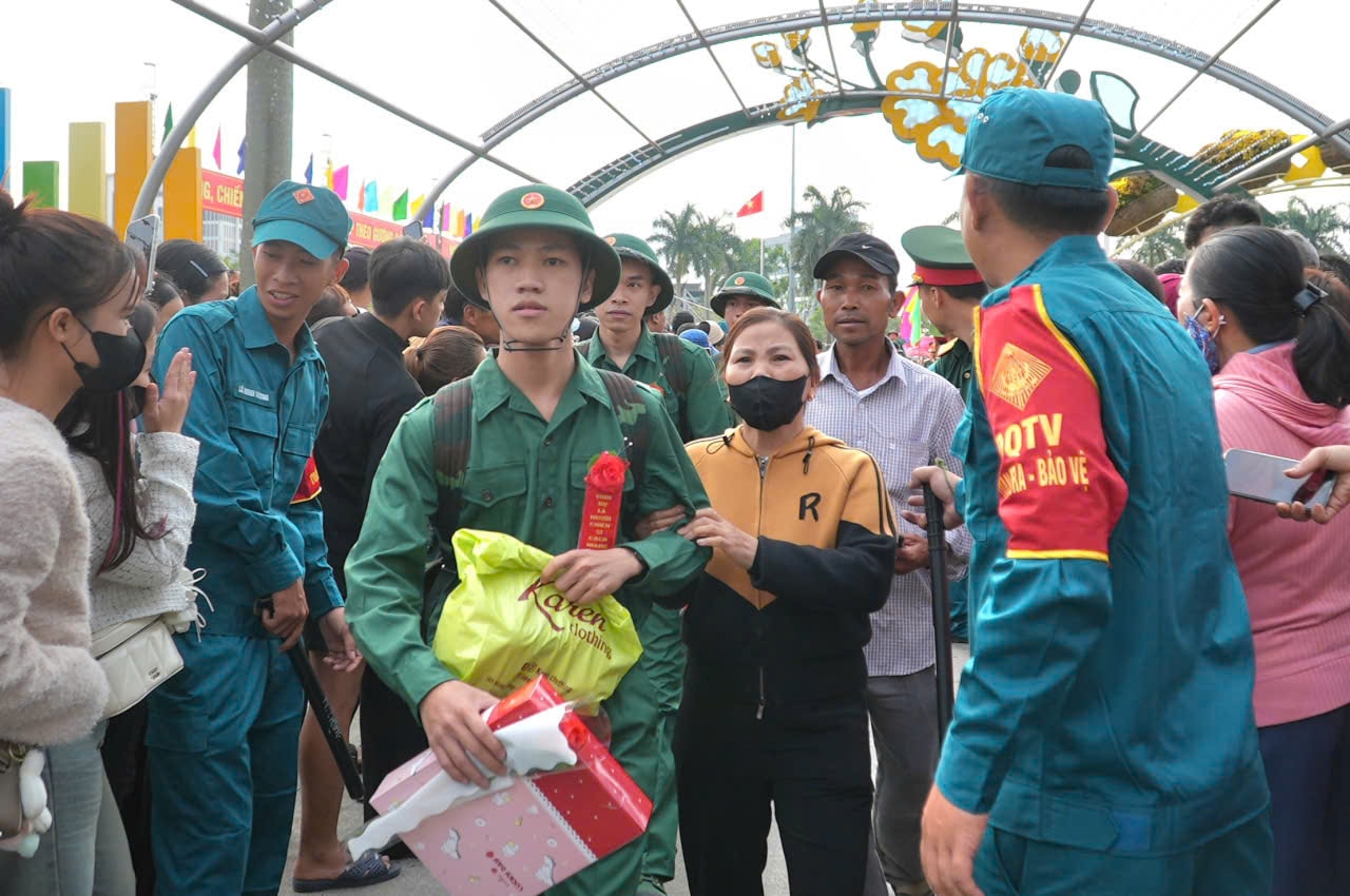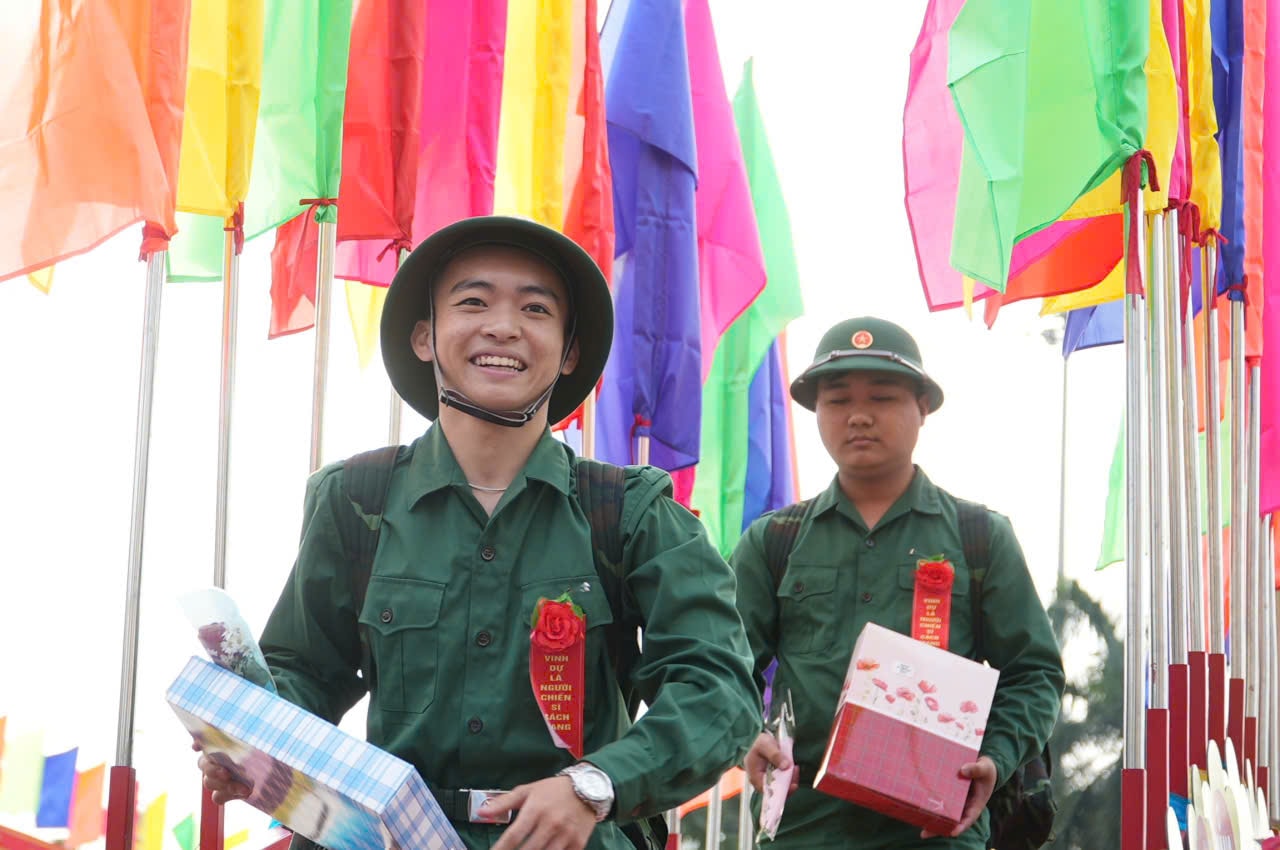 Trong không khí rộn ràng của lễ giao nhận quân, lãnh đạo thành phố và các địa phương cùng gia đình, người thân tặng hoa, động viên các chiến sĩ lên đường thực hiện nghĩa vụ thiêng liêng với Tổ quốc.
