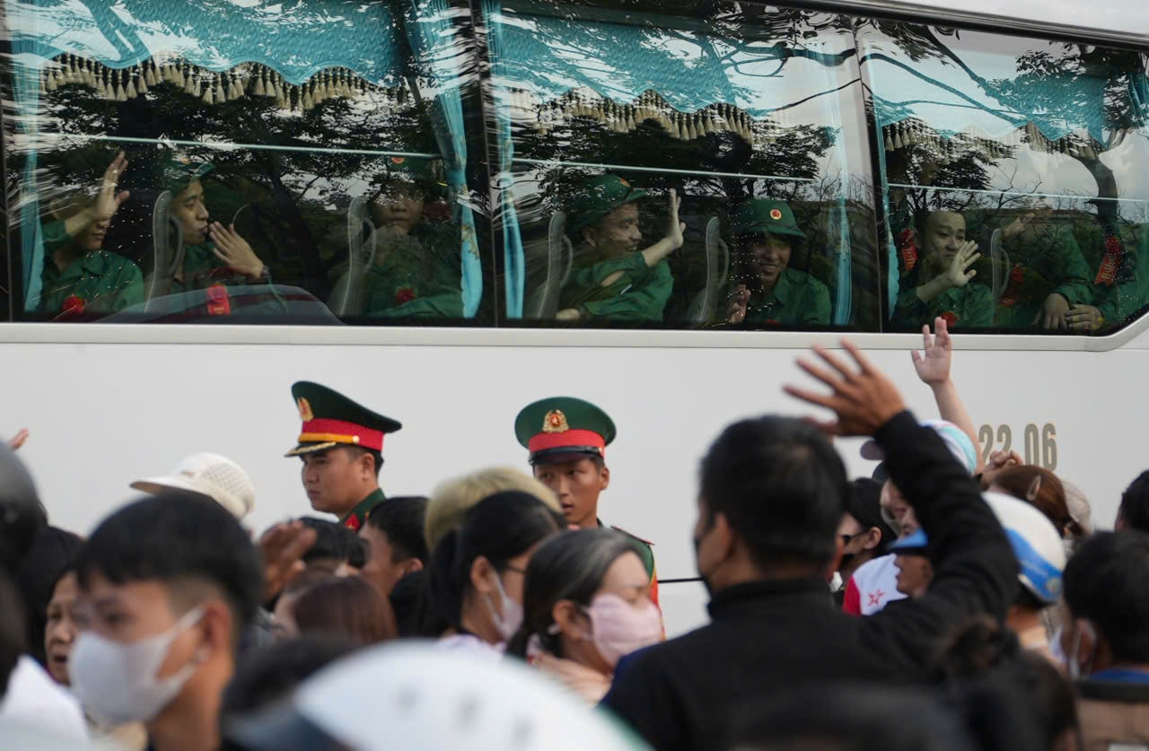Người thân chào tạm biệt các thanh niên trúng tuyển nghĩa vụ quân sự. Ảnh: HOÀNG ĐẠO