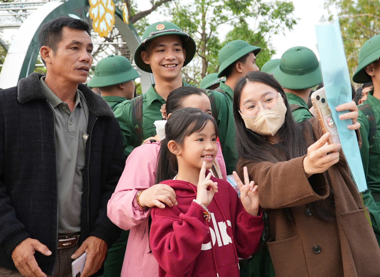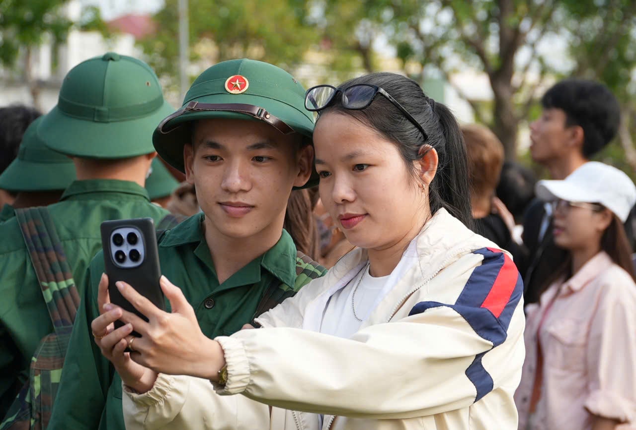 Các chiến sĩ lưu lại khoảnh khắc với người thân trước khi nhập ngũ. Ảnh: HỒ QUÂN
