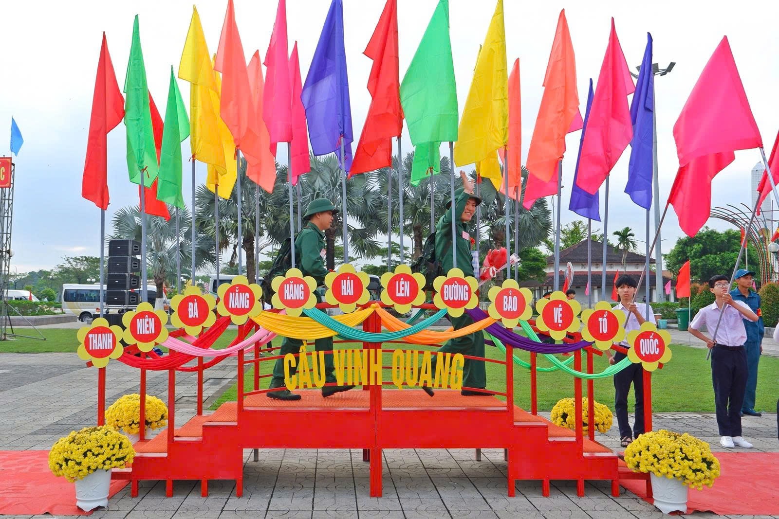 Các chiến sĩ tại điểm giao, nhận quân số 4, Ban Chỉ huy Phòng thủ khu vực 1 - Cẩm Lệ bước qua Cầu vinh quang. Ảnh: XUÂN SƠN