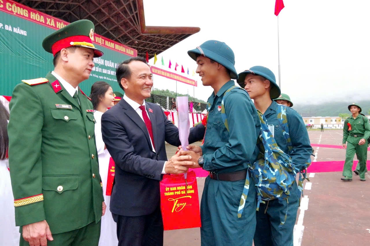 Ủy viên Trung ương Đảng, Bí thư Thành ủy Lê Ngọc Quang tặng hoa, động viên các chiến sĩ lên đường nhập ngũ tại điểm giao, nhận quân số 2 - Ban Chỉ huy Phòng thủ khu vực 1 - Cẩm Lệ. Ảnh: NGỌC PHÚ