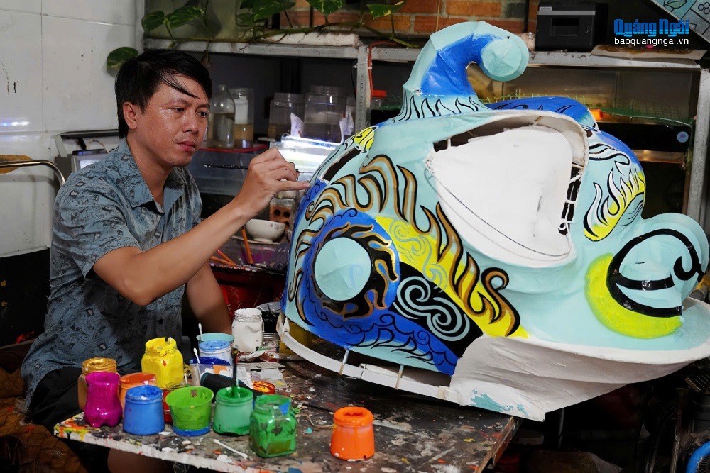 Anh Nguyễn Quang Thắng chăm chú vẽ những đường nét cuối cùng trên chiếc đầu lân, với sắc màu rực rỡ.