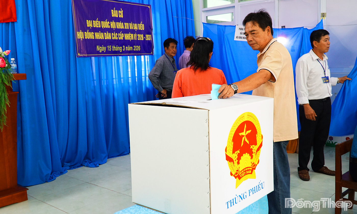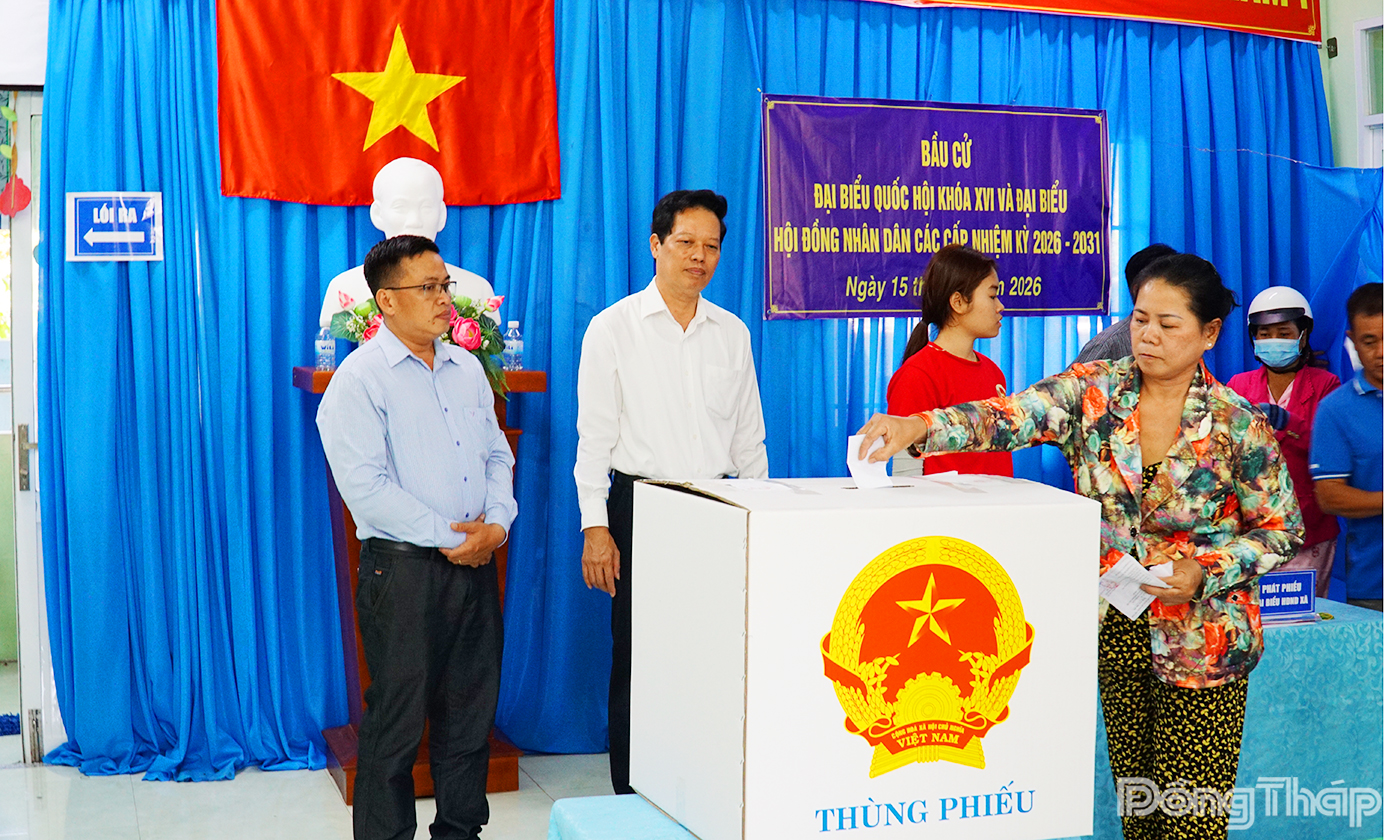 Cử tri xã Gia Thuận, tỉnh Đồng Tháp phấn khởi tham gia bỏ phiếu tại khu vực bỏ phiếu trong ngày bầu cử.