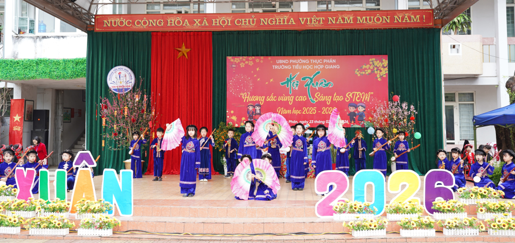 Tiết mục văn nghệ Ngày hội Xuân “Hương sắc vùng cao - Sáng tạo Stem năm học 2025 - 2026” tại Trường Tiểu học Hợp Giang, phường Thục Phán.