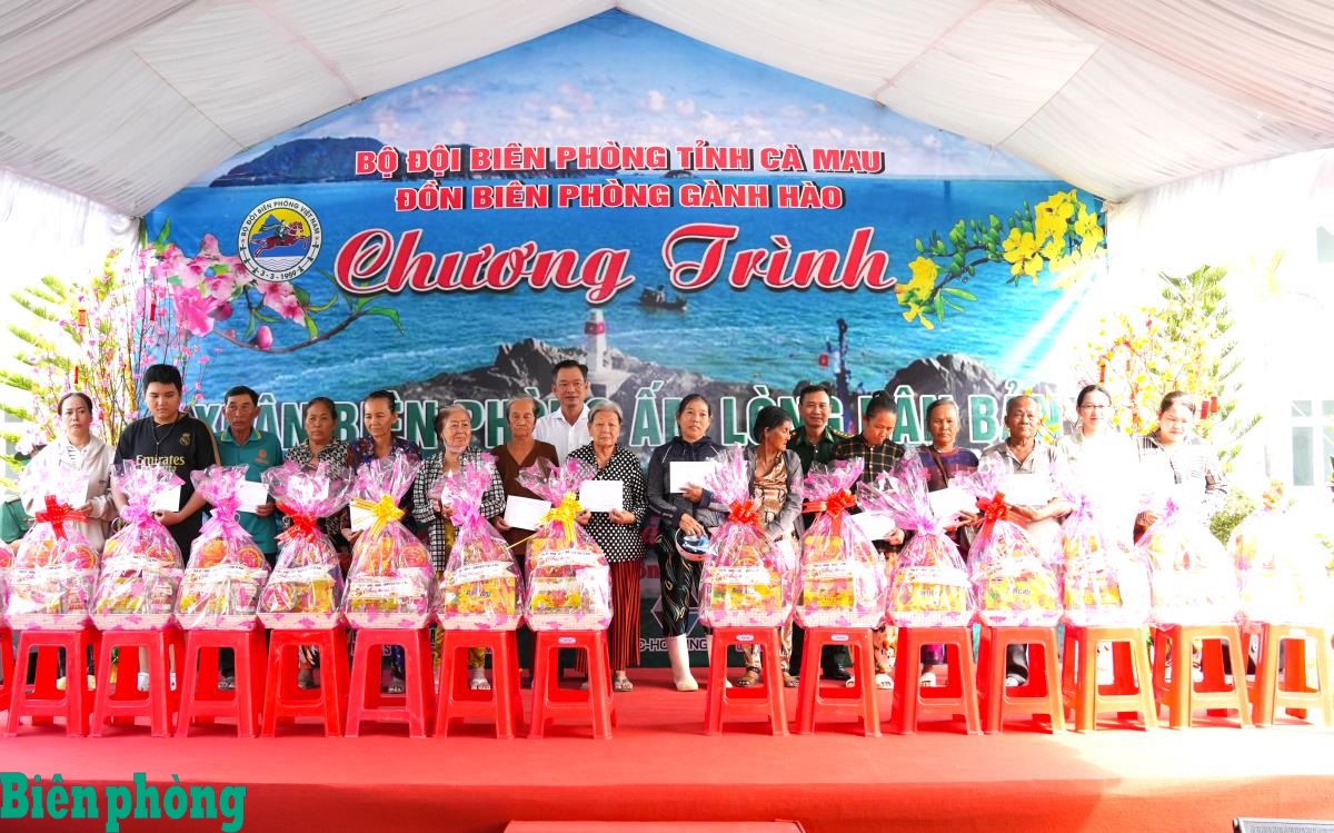Đại tá Nguyễn Quang Hà, Phó Chính ủy Bộ đội Biên phòng tỉnh Cà Mau và đồng chí Nguyễn Văn Khởi, Phó Chủ tịch Ủy ban Mặt trận Tổ quốc Việt Nam tỉnh Cà Mau trao quà Tết cho người nghèo ở khu vực biên giới biển. Ảnh: Hoàng Tá