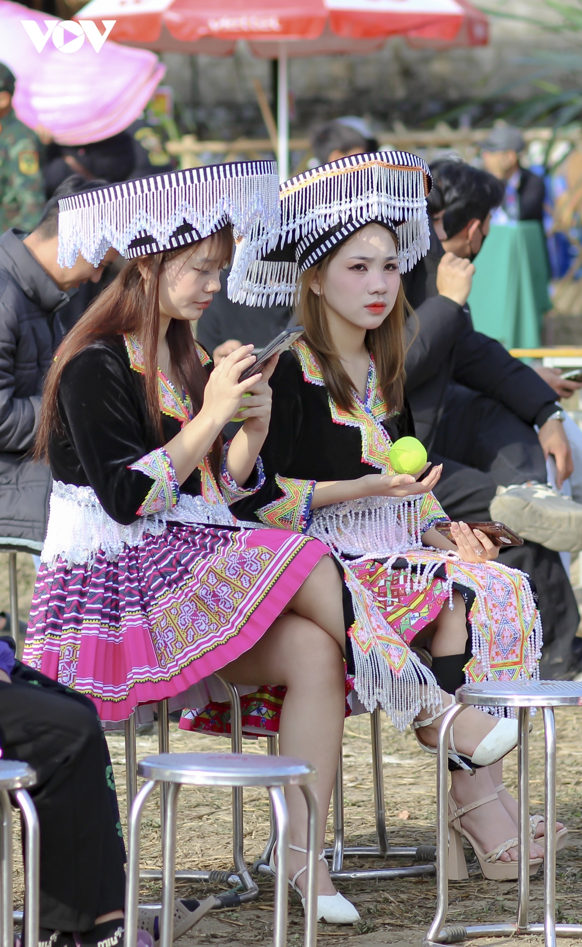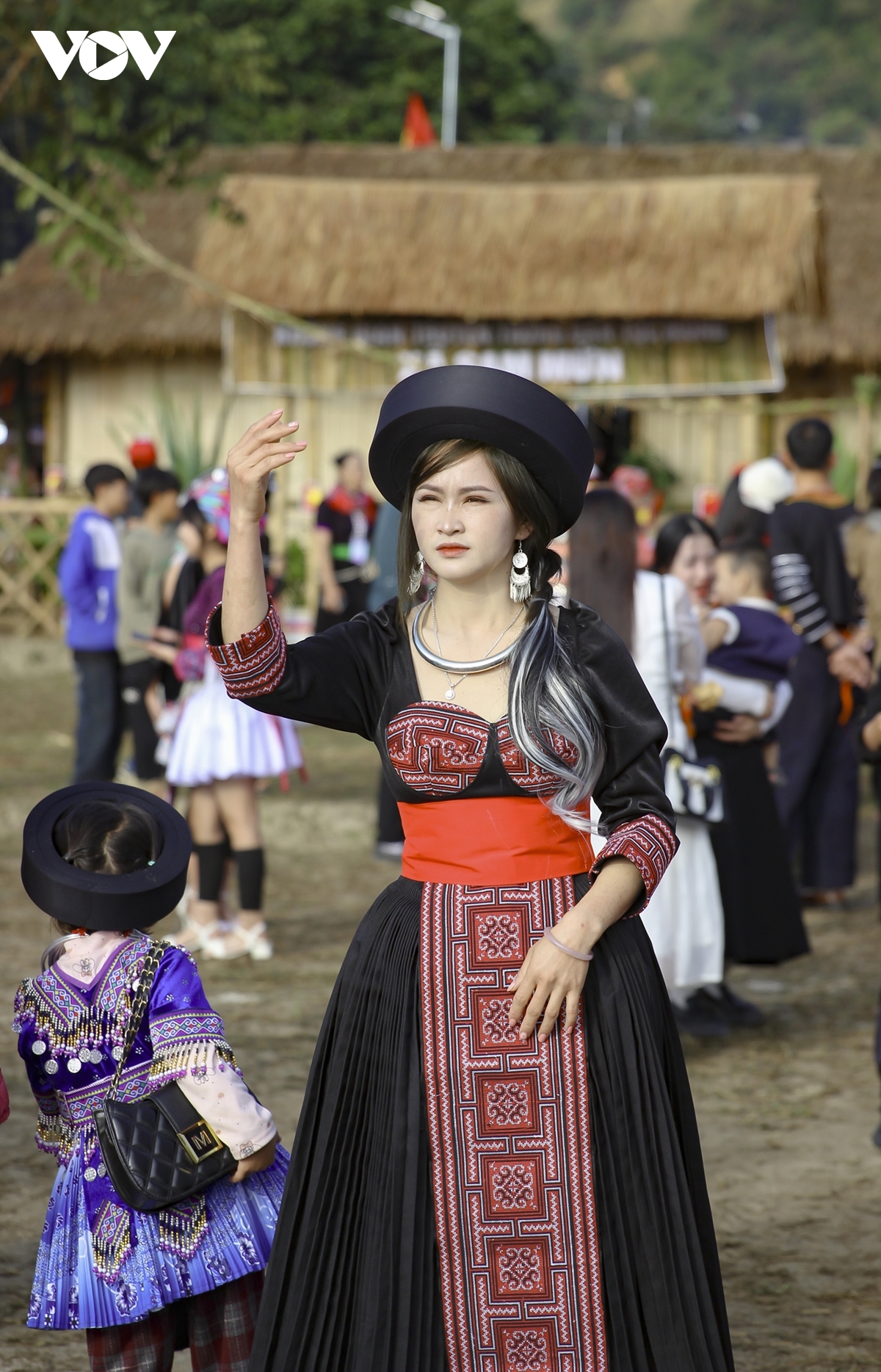 Các cô gái Mông khoác lên mình trang phục truyền thống rực rỡ đi vui hội.