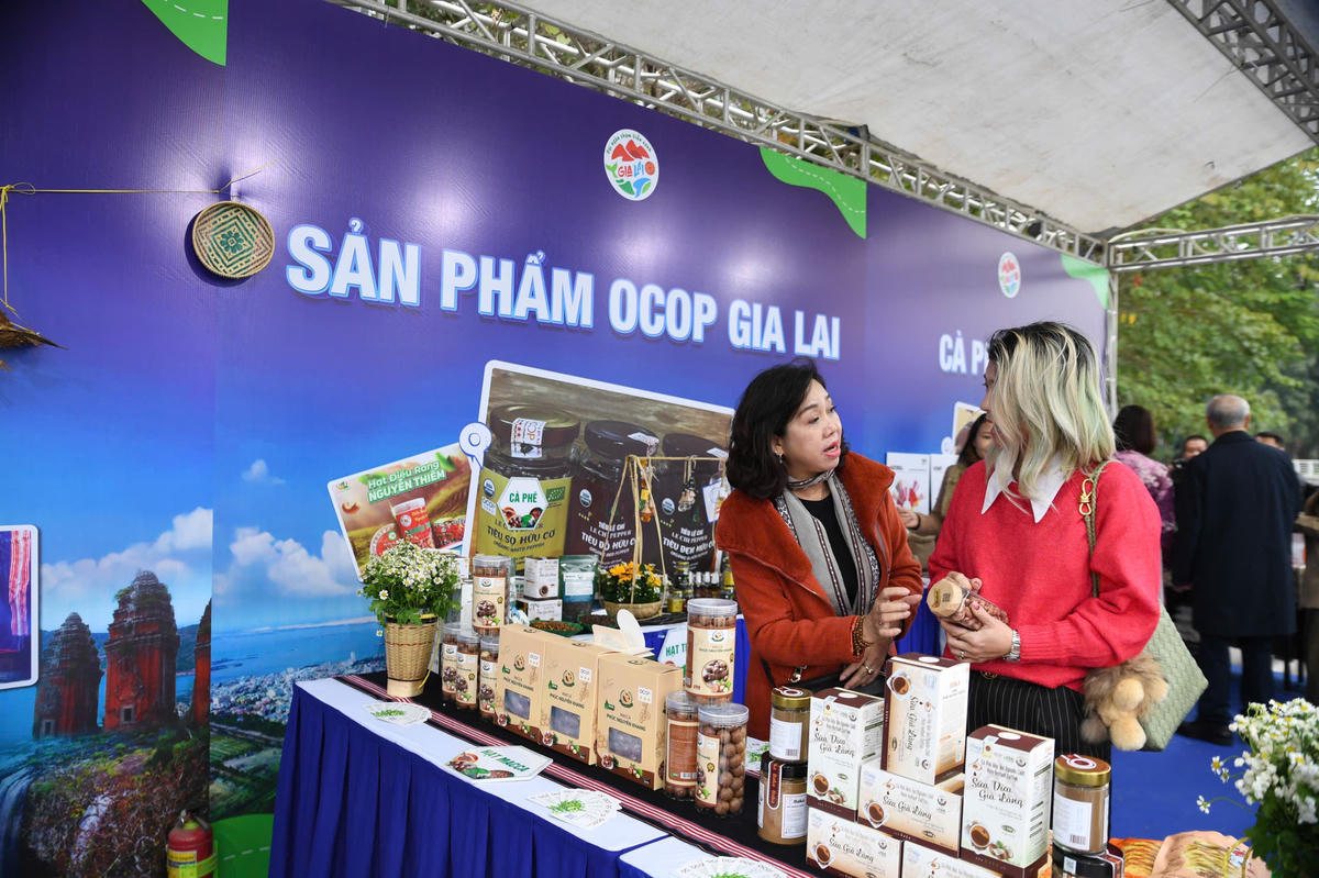 Không gian văn hóa sáng tạo Tây Hồ rực rỡ sắc màu với các gian trưng bày du lịch, ẩm thực và đặc sản Gia Lai, thu hút đông đảo người dân và du khách Thủ đô đến tham quan, trải nghiệm. Ảnh: Phạm Sỹ.
