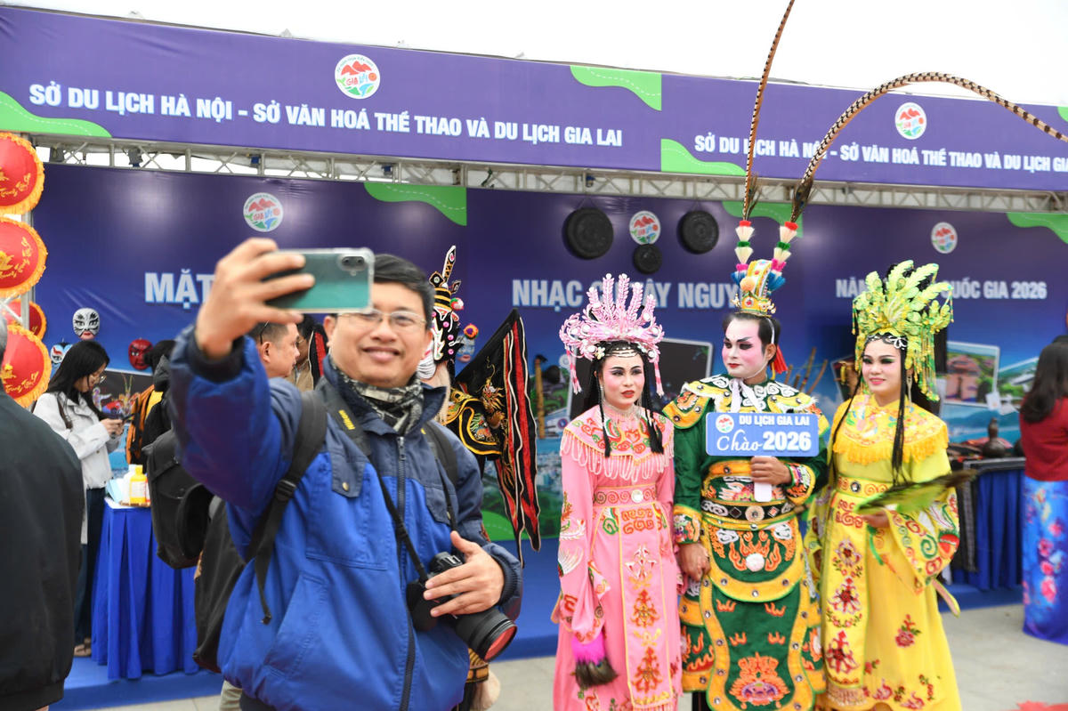 Không gian check-in được thiết kế sinh động, mang đậm sắc màu Tây Nguyên, trở thành điểm dừng chân hấp dẫn để du khách lưu lại những khoảnh khắc đáng nhớ tại Ngày hội Du lịch Gia Lai giữa lòng Thủ đô. Ảnh: Phạm Sỹ.