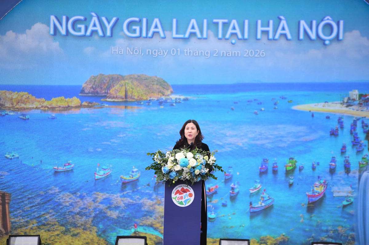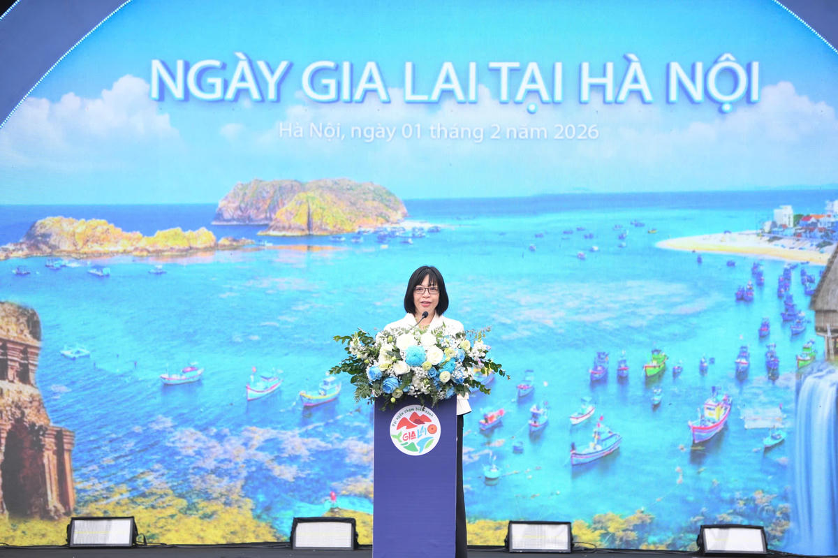 Bà Nguyễn Thị Thanh Lịch Phó Chủ tịch UBND tỉnh Gia Lai phát biểu khai mạc, nhấn mạnh vai trò của Ngày hội trong việc quảng bá hình ảnh du lịch địa phương và kết nối Gia Lai với thị trường du lịch Hà Nội. Ảnh: Phạm Sỹ.