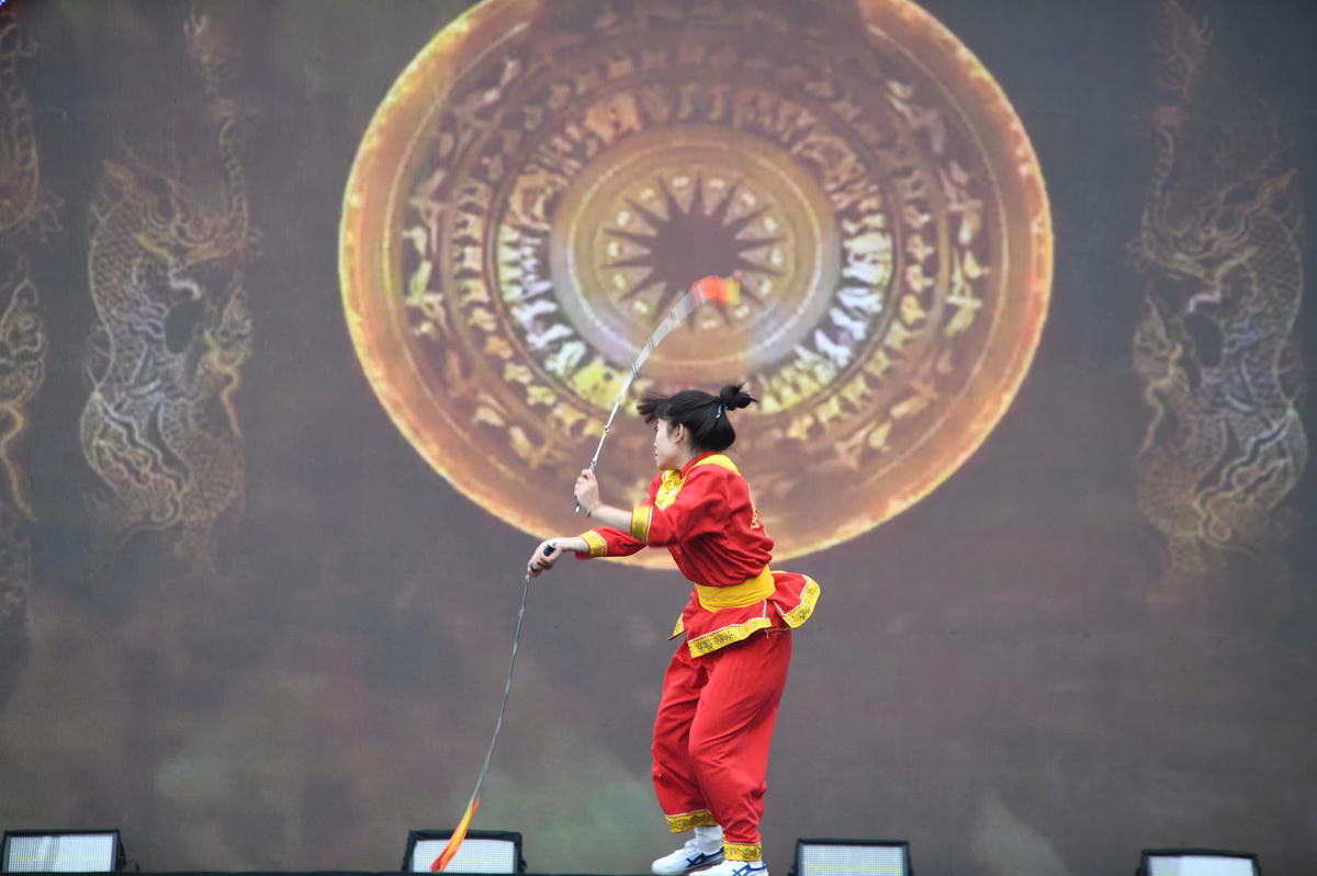 Tiết mục võ cổ truyền Bình Định được trình diễn mạnh mẽ, dứt khoát giữa không gian ngày hội, góp phần tôn vinh tinh thần thượng võ và làm nổi bật chiều sâu văn hóa trong chuỗi hoạt động quảng bá du lịch Gia Lai tại Hà Nội. Ảnh: Phạm Sỹ.
