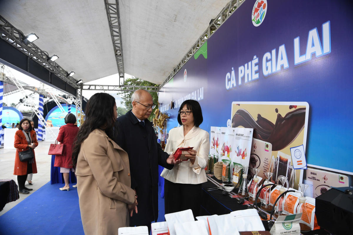 Gian trưng bày đặc sản Gia Lai thu hút đông đảo khách tham quan với nhiều sản phẩm tiêu biểu của vùng đất cao nguyên, góp phần quảng bá hương vị địa phương. Ảnh: Phạm Sỹ.