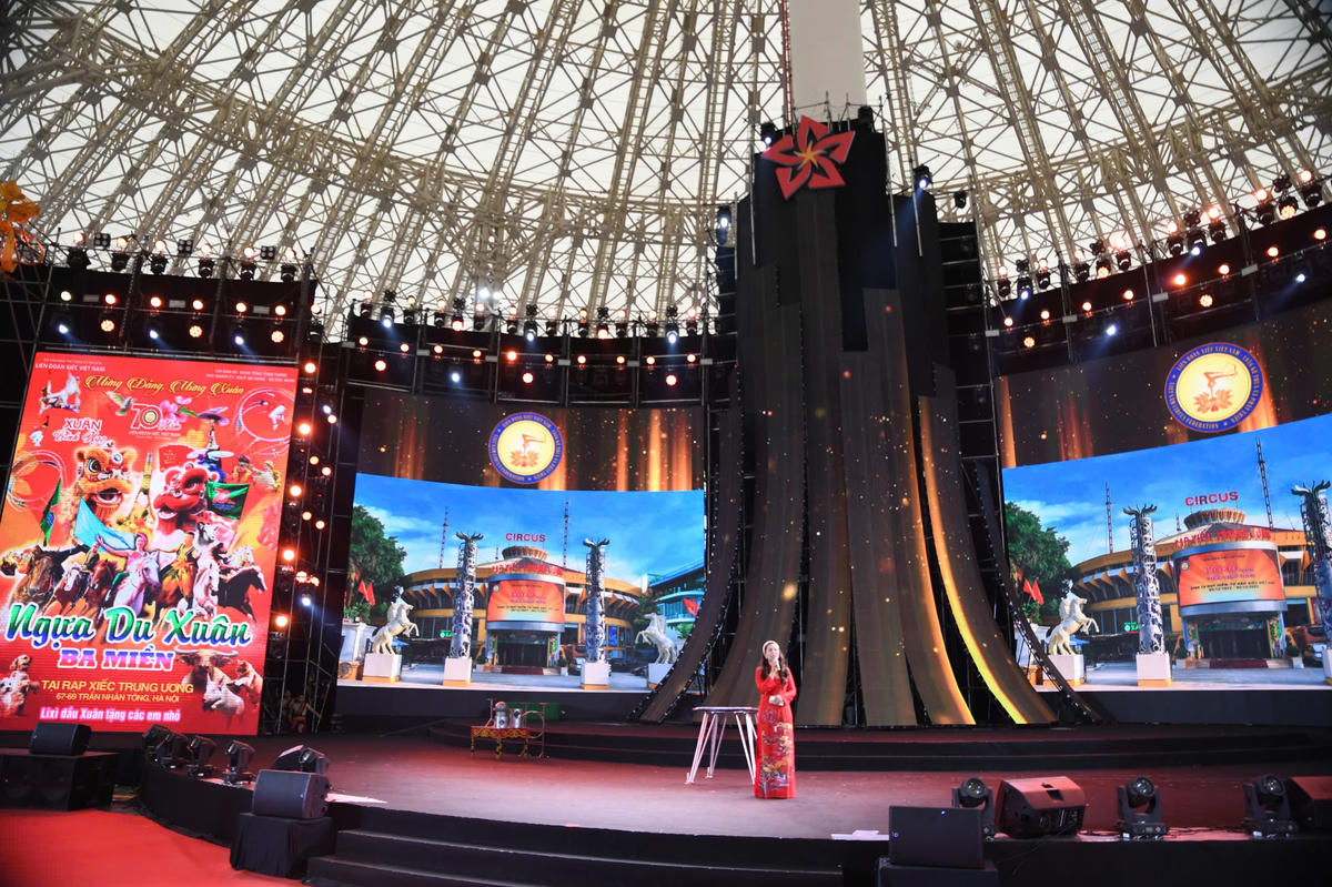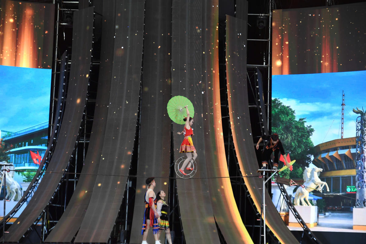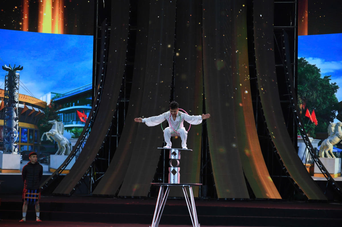 Bằng ngôn ngữ xiếc, các nghệ sĩ đã đêm đến cho khán giả những nét đẹp văn hóa vùng cao với sắc màu trang phục truyền thống và nhịp điệu rộn ràng, khắc họa vẻ đẹp văn hóa đa dạng của các dân tộc trong không khí mùa xuân. Ảnh: Phạm Sỹ.
