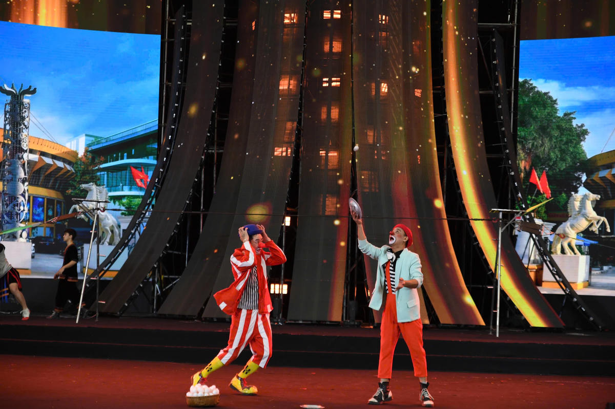 Bằng lối diễn hài hước, duyên dáng và những tình huống bất ngờ, hai chú hề khuấy động bầu không khí hội chợ, mang lại tiếng cười sảng khoái cho khán giả ở mọi lứa tuổi. Ảnh: Phạm Sỹ.