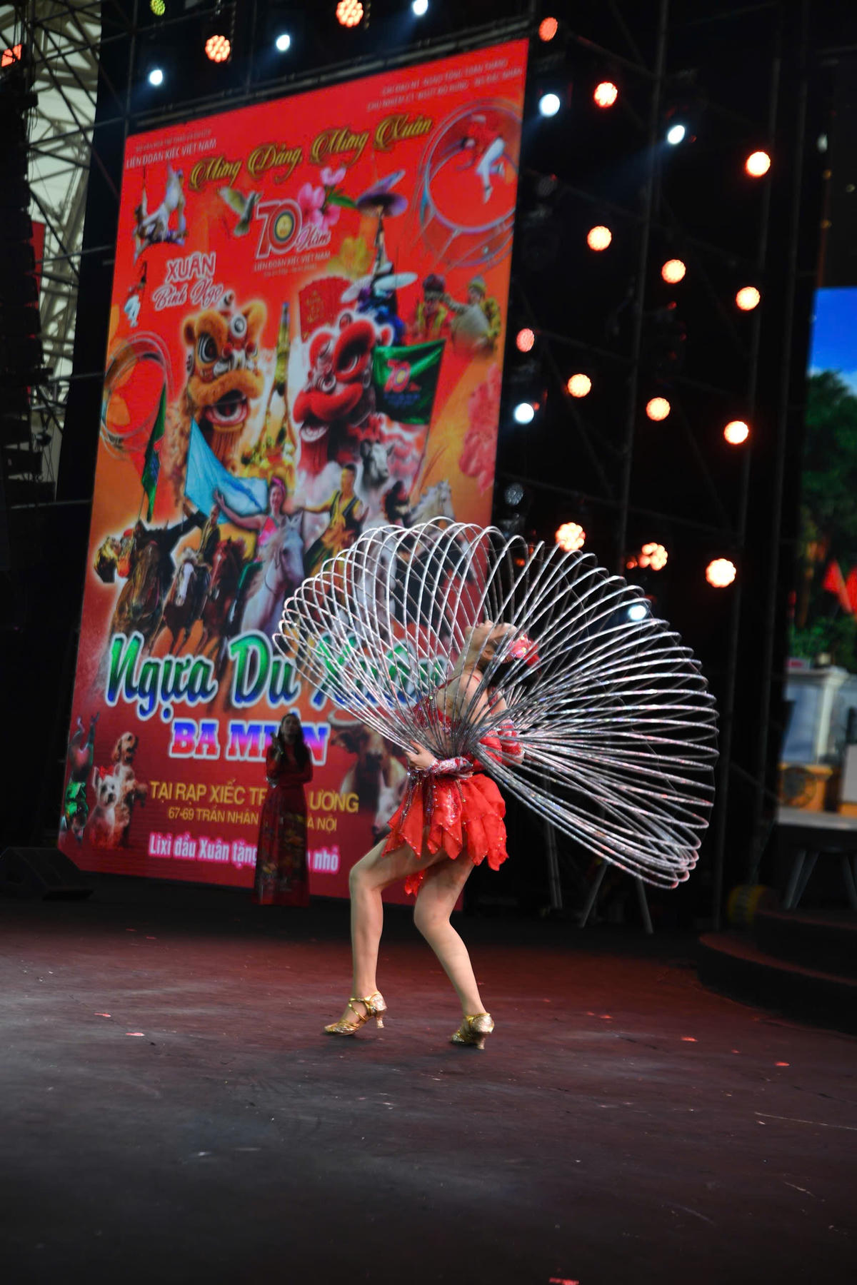 Những chiếc vòng xoay nhịp nhàng theo chuyển động cơ thể, tạo nên vệt màu sống động trong không gian sân khấu, tôn lên vẻ đẹp mềm mại, dẻo dai và sự hòa quyện giữa nhịp điệu hiện đại với tinh thần lễ hội ngày xuân. Ảnh: Phạm Sỹ.