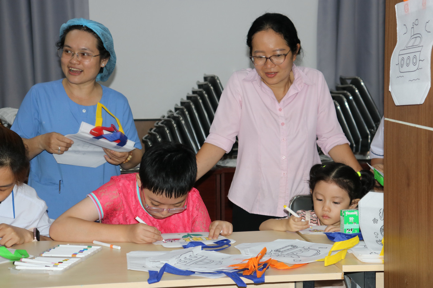 Tại đây, tiếng trống múa lân cùng giai điệu của các bài hát trung thu quen thuộc hòa lẫn cùng tiếng cười đùa của hàng trăm bệnh nhi, thiếu nhi đang háo hức chờ khai mạc đêm hội trăng rằm đến sớm. Các em được thỏa sức tham gia các trò chơi như vẽ tranh, nặn tò he, làm cào cào lá dừa… Các em còn được nhận lồng đèn để cùng rước đèn.