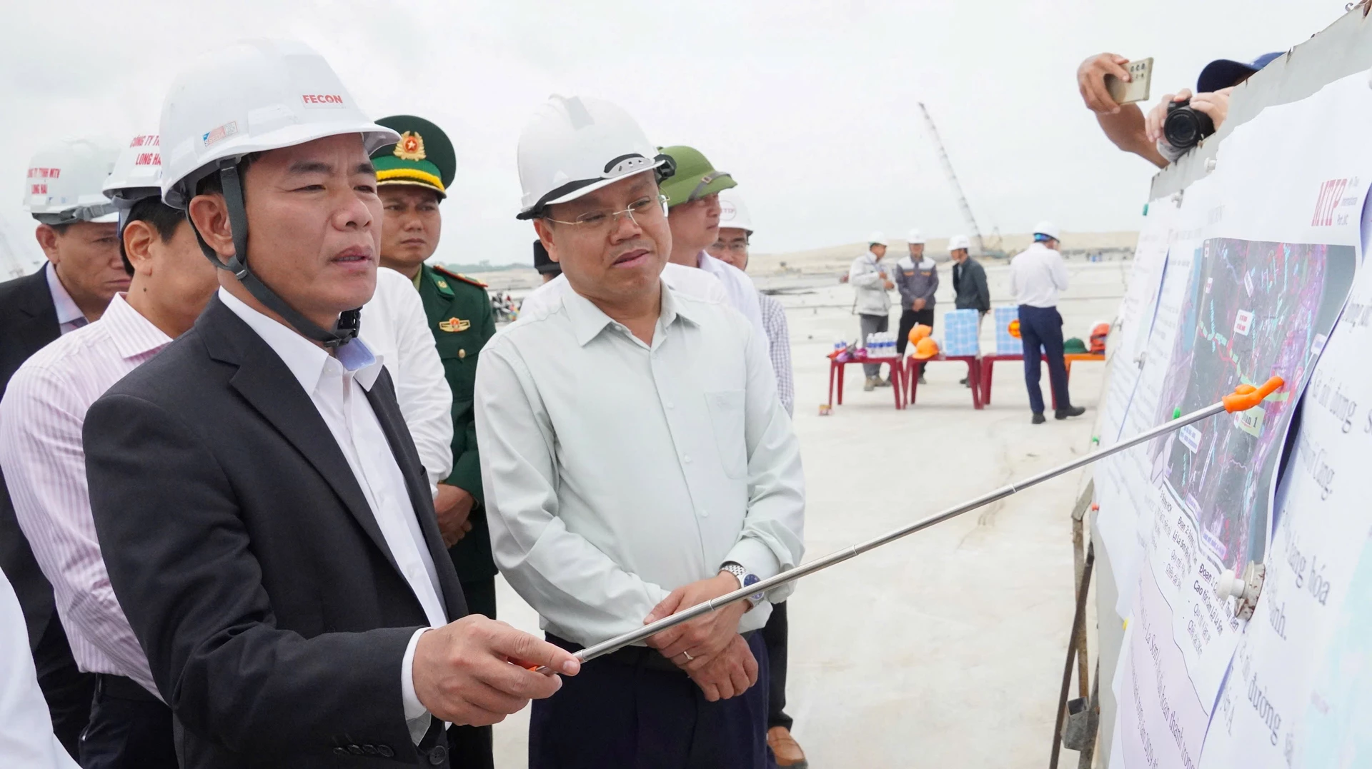 Đồng chí Nguyễn Văn Phương, Ủy viên Trung ương Đảng, Bí thư Tỉnh ủy kiểm tra tiến độ thi công tại dự án Khu bến cảng Mỹ Thủy vào sáng 24/2 - Ảnh: L.T