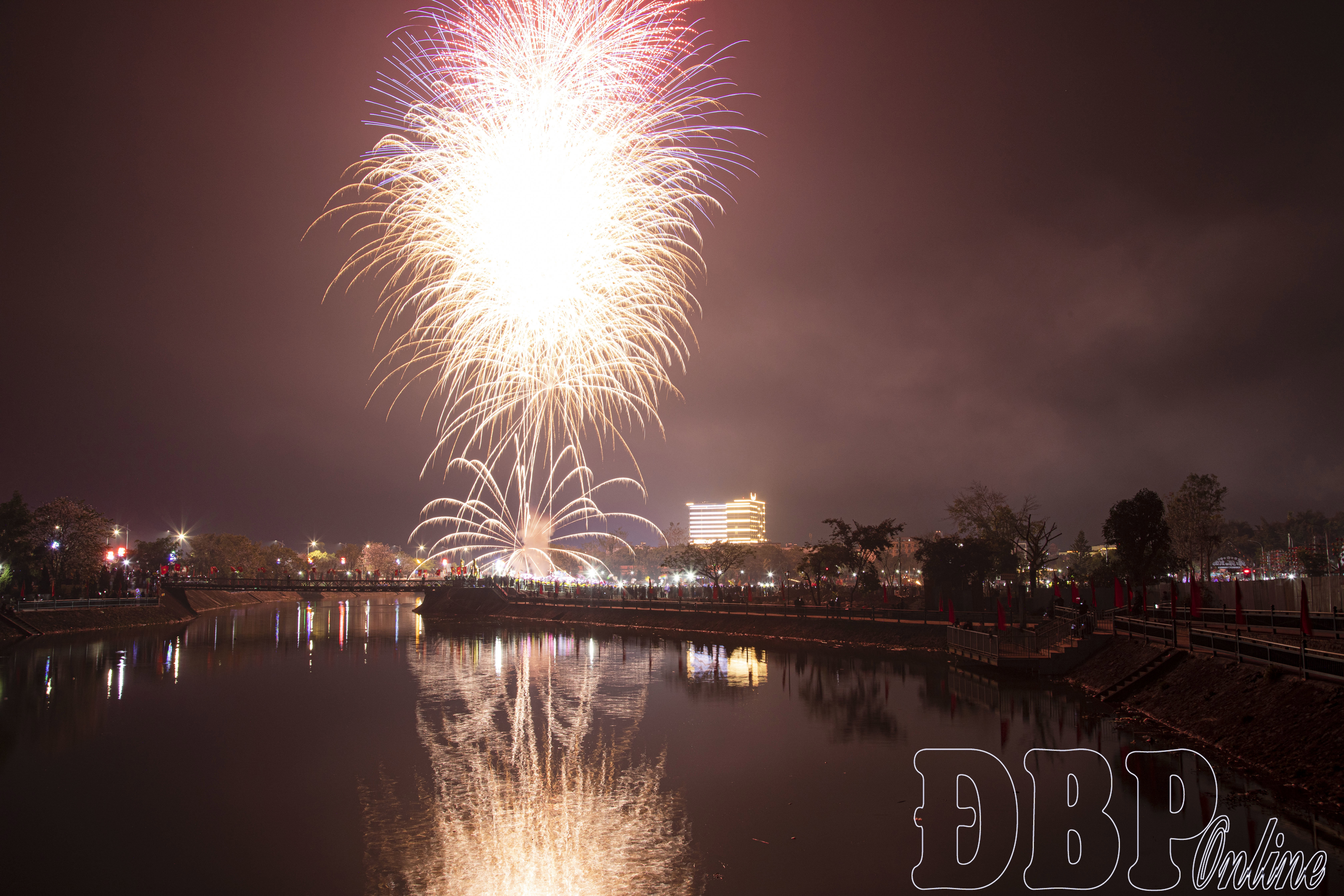 Pháo hoa bung nở rực rỡ trên bầu trời Điện Biên Phủ.