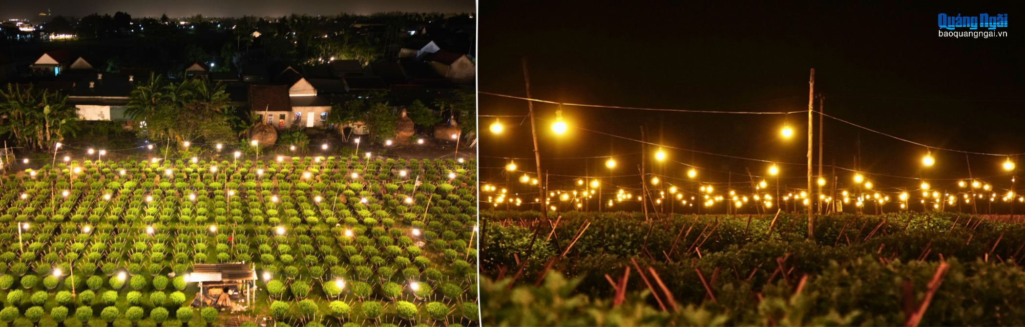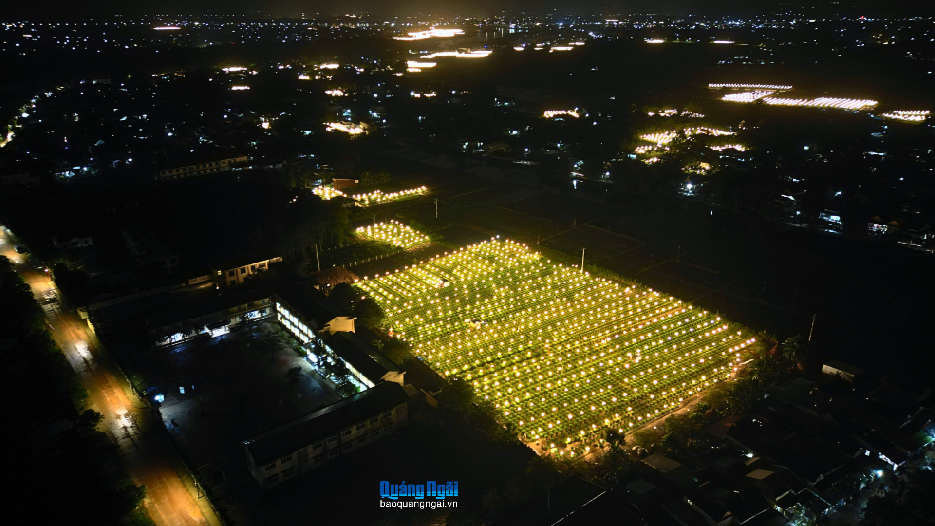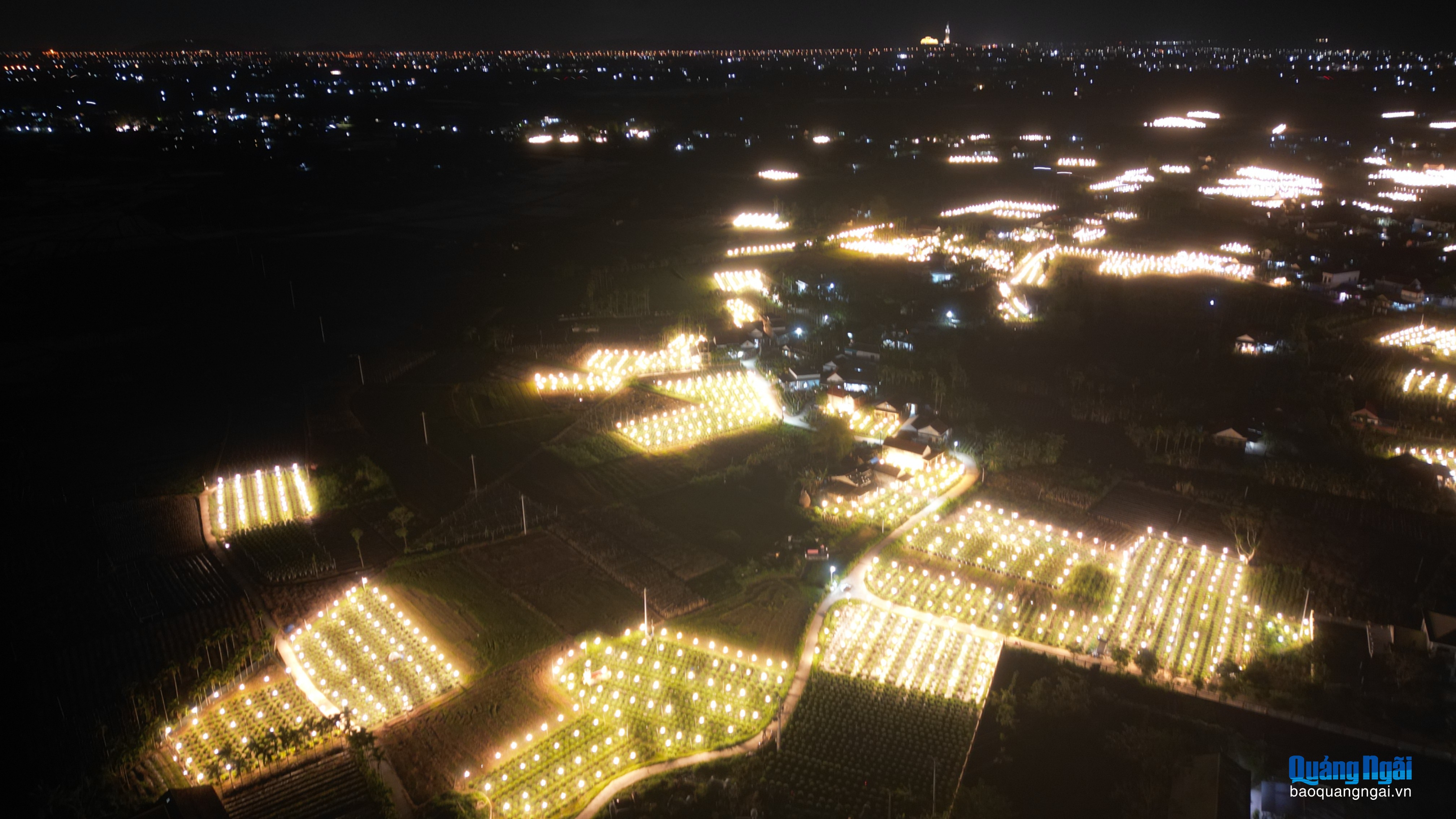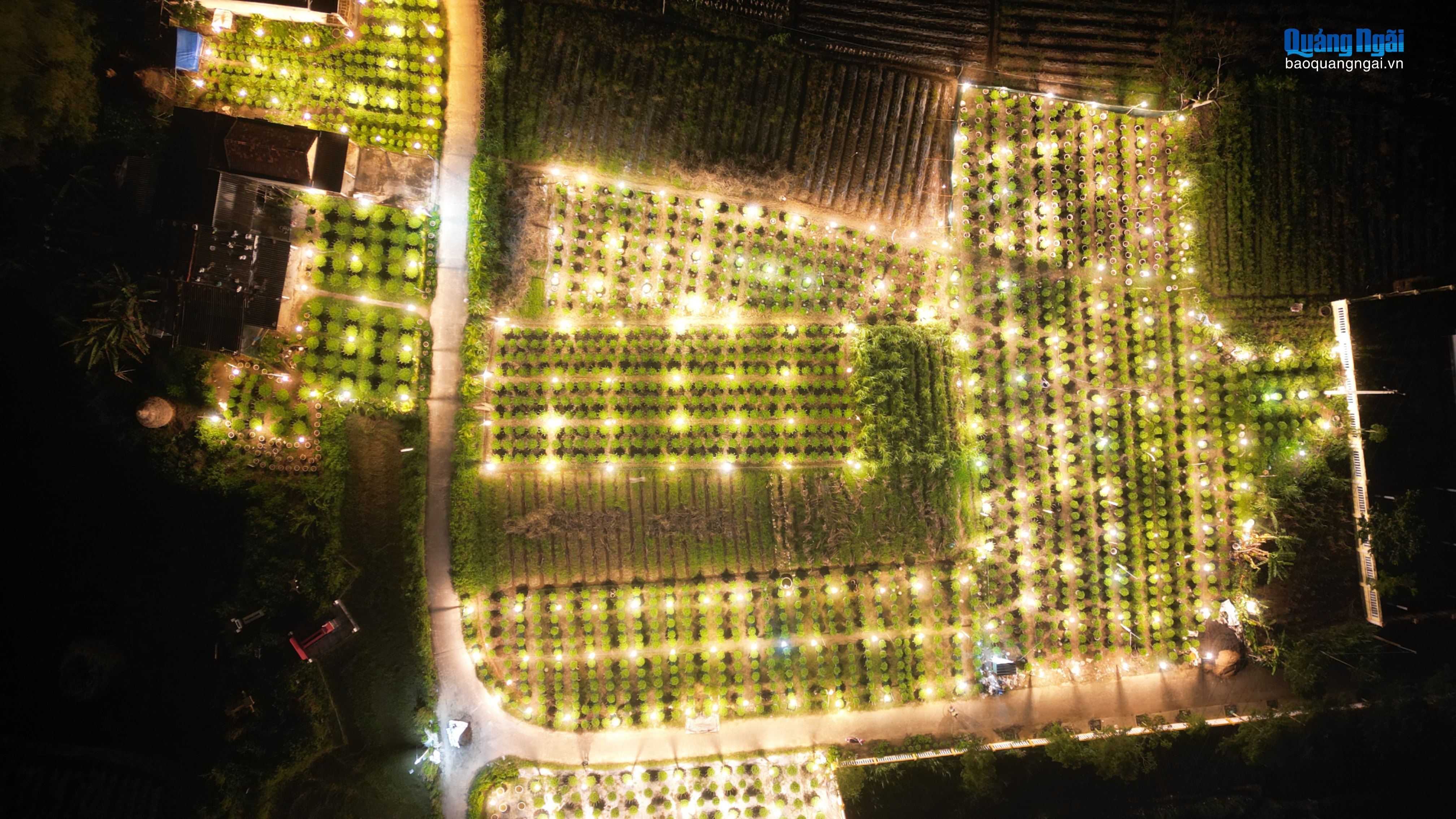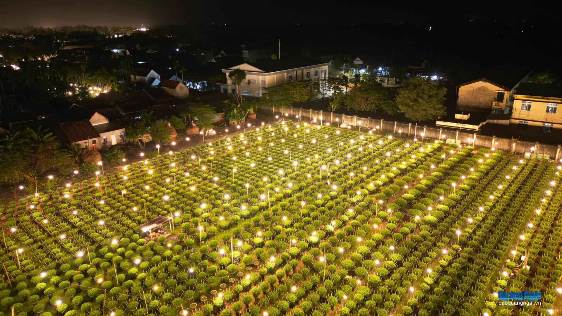 Nhìn từ trên cao, làng hoa Nghĩa Hiệp rực sáng giữa màn đêm, báo hiệu mùa xuân đang đến rất gần.